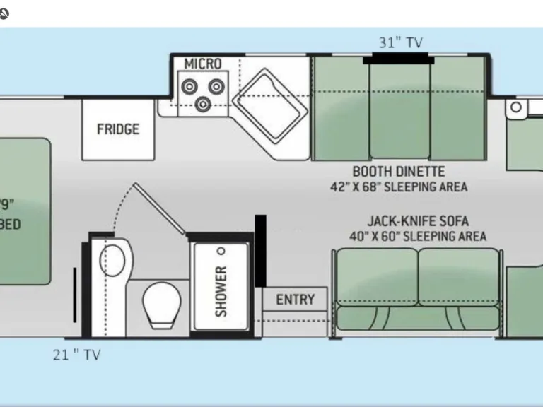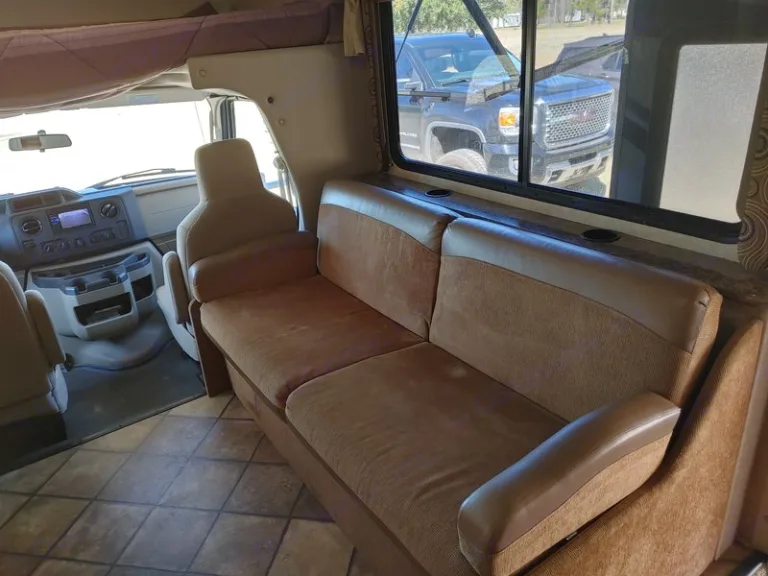 The Thor Freedom Elite floor plan has been chosen as the best one amongst the same size motorhome competitors. Our motor couch has a queen size bunk bed above the cabin, a dinette zone that transforms into a full-size bed, a jack-knife couch, and a queen size master bed. The kitchenette equipped with a 3-burner gas stove, microwave, full-size kitchen sink, and a 2-door refrigerator. The RV has a slide out which allows to increase the living space when camping. The location of the master bedroom on the rear end, in our opinion, is the best, as it allows travelers to rest without additional setups. Plus it has a privacy curtain. The bathroom has a shower with sliding doors, a toilet, and a sink. The RV has an enormous amount of storage space for your belongings, 8 cup holders to secure your drinks from spills. A 32" TV with DVD player is mounted in the living room, so you can enjoy your favorite movie while dining.