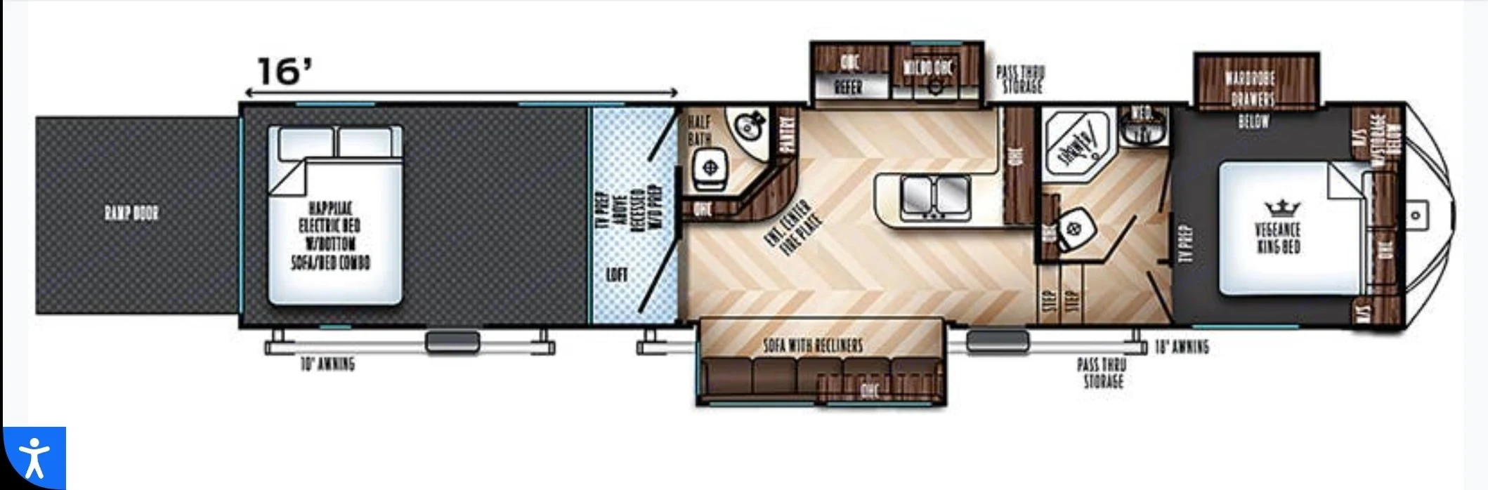 *** Camper requires a 50 amp plug in for electric****This camper is truly a home away from home. There is plenty of space for everyone, so you won't feel like you are in a cramped camper!The master has a brand new queen bed (replaced 6/25),with plenty of storage and direct access to the full size bathroom. There is a cozy full size loft bed over the main living area and queen bunk beds in the 16 ft garage area. In the living area you will find a fireplace and a leather couch that is heated and massaging!The camper comes fully stocked with all your toiletries, towels, blankets and pillows. We have made sure to stock the kitchen with silverware, hand towels, pots and pans. You can spend all day outdoors and have a comfortable and cozy place to come back too.*Any costs for damages will be taken from your deposit.*Dumping fee will be taken from deposit.*Any evidence of smoking in the camper will result in the loss of your total depositWhat's included• Toilet paper