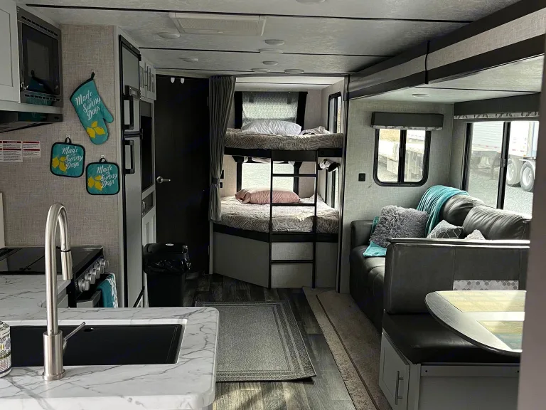 Welcome to our 2020 Keystone Bullet! This trailer comes fully loaded with everything and more to accommodate your fun filled camping trips ! Where all the best memories will be made !Our bullet features a comfortable private master bedroom with a queen bed. A dinette for 4 that also converts into a bed! A lovely sofa bed in the living room situated perfectly in front of a flat screen TV for those rainy times. Double bunk beds for the littles of your life !