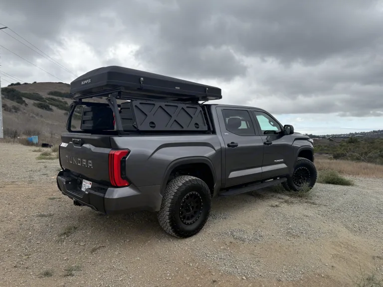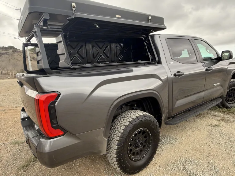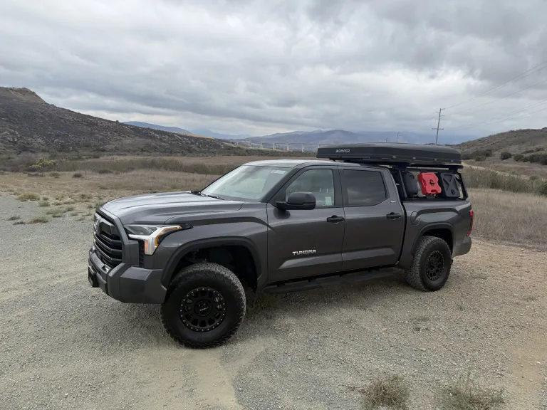 Embark on your next adventure in this rugged yet comfortable Toyota Tundra SR5 Overland setup, built for off-grid exploration and memorable road trips.This Tundra is equipped with a premium iKamper rooftop tent that sets up in minutes and comfortably sleeps two adults (plus a child or pet if needed). With its lifted suspension, all-terrain BFGoodrich tires, and upgraded off-road wheels, the truck handles dirt roads, campsites, and scenic byways with ease.The custom overland rack system comes loaded with mounted water storage and hose sprayer, RotopaX fuel and water containers, and secure side storage for your gear. The spacious truck bed and locking canopy keep your equipment safe and dry, while the roomy rear cabin provides additional space for luggage or coolers.Whether you’re chasing the mountains, desert, or beach, this Tundra is ready to deliver a comfortable and capable overlanding experience.
