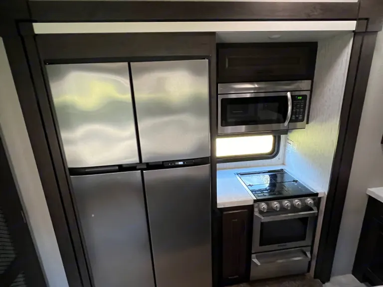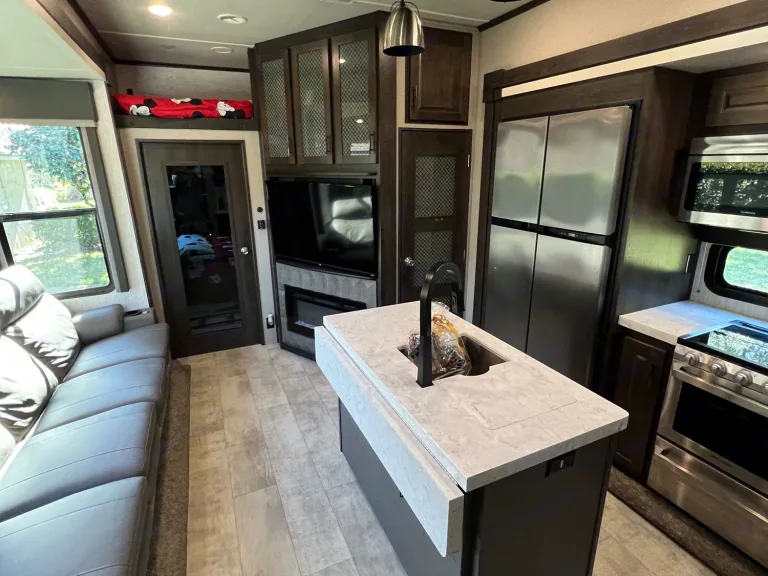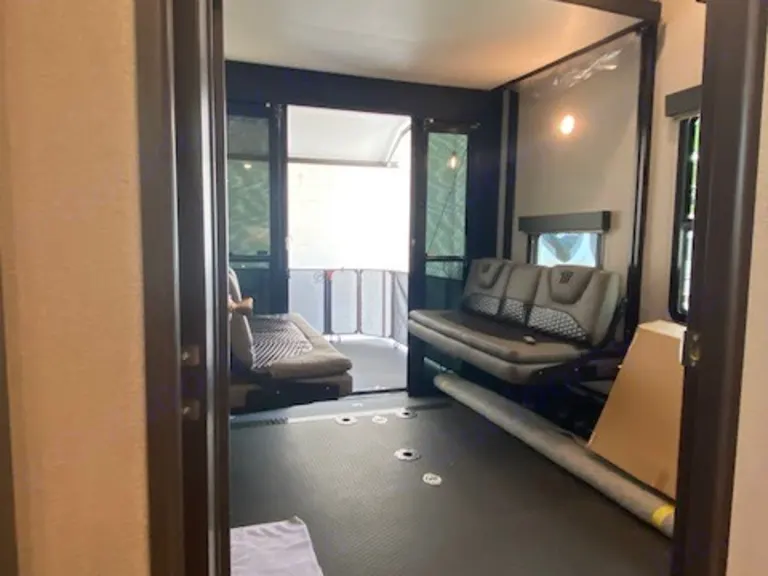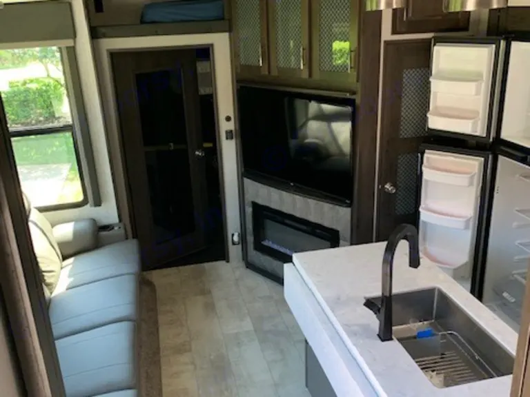 This trailer is for deliveries only, no self hauling. This is an early 2021 model and provides room for 7 people comfortably. There won't be any rocking with the 6 point hydraulic leveling system and the central vacuum system will help keep things clean. Units comes with 3 AC units to keep it cool in the summer. The main area comes with a residential size fridge with freezer, 3 burner stove, oven and a microwave/convection oven combo. The center island has a large stainless steel sink that also functions as a bar with 2 bar stools. Trailer has a 4 person supersofa with individual recliners facing a 50'' TV. End seats have massagers, heaters, cupholders and swivel tables. There is also an electric fireplace that serves as a small heater when needed. Above the garage entry, there is a sleeping nook that can sleep an adult
