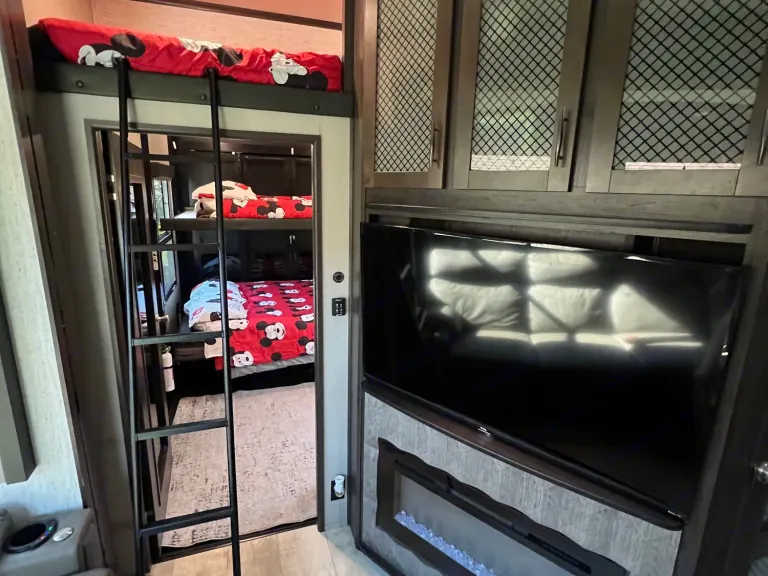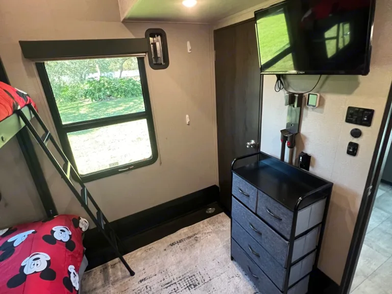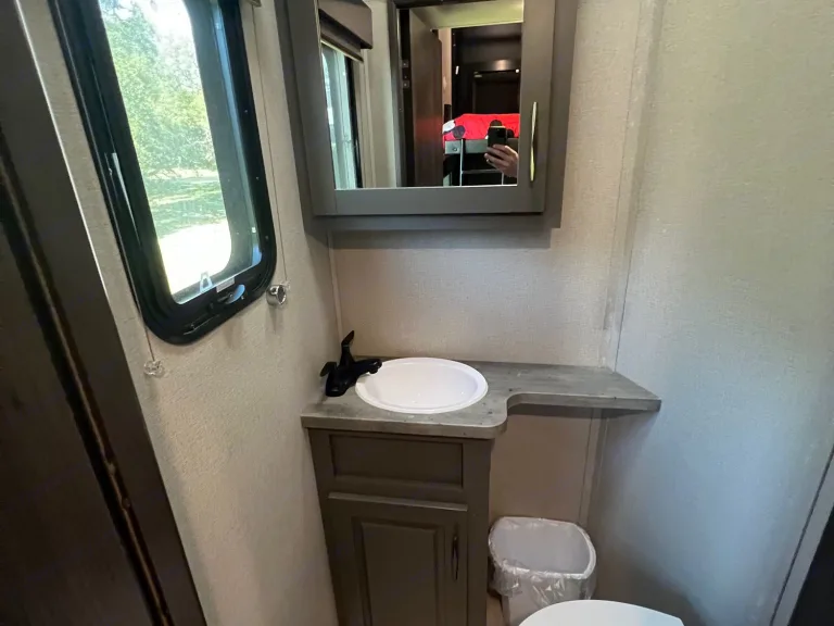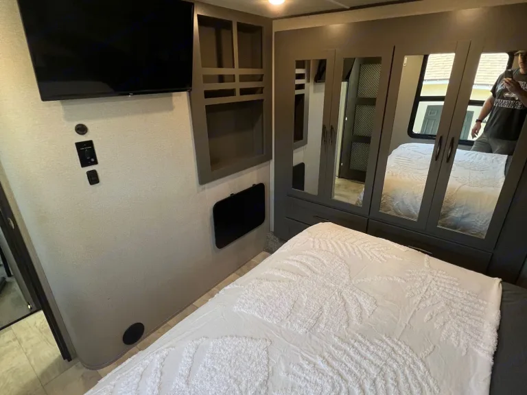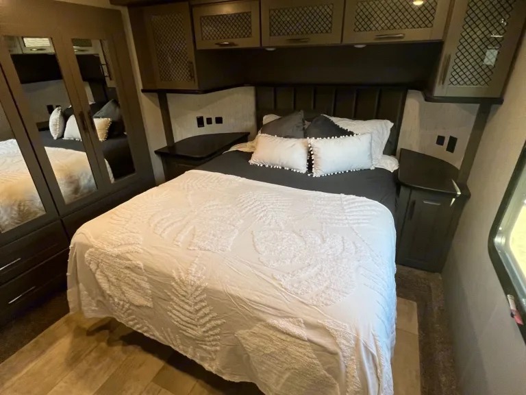 Upfront is the main bathroom with a large shower and the master bedroom with a queen size bed and a smart TV. Trailer also has an outdoor TV, 2 Awnings to the side and one out the back over the patio.I am happy to deliver and setup within 100 miles for a flat fee of $200 for the first 50 miles, $6/mile thereafter.The unit has an onboard generator that can be used for an additional cost and can hold up to 60 gallons of gas. $5/hourFresh Water capacity: 155 Gal