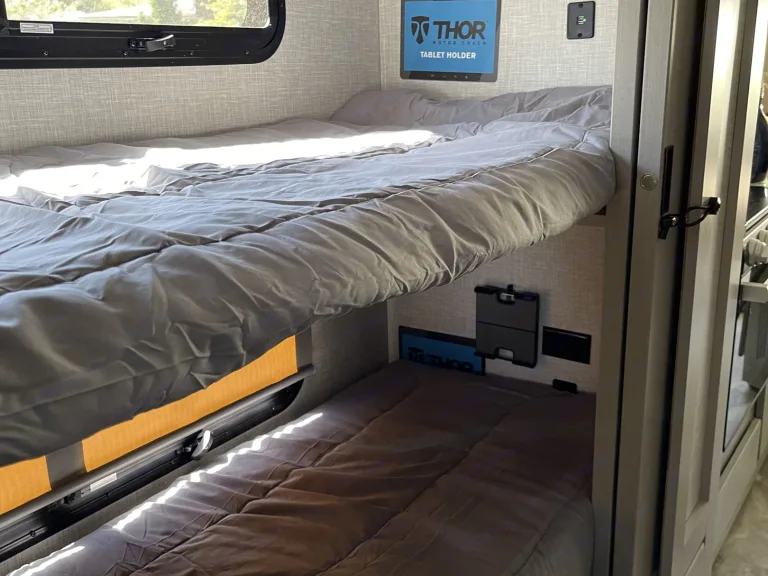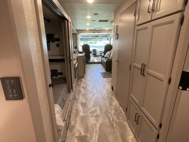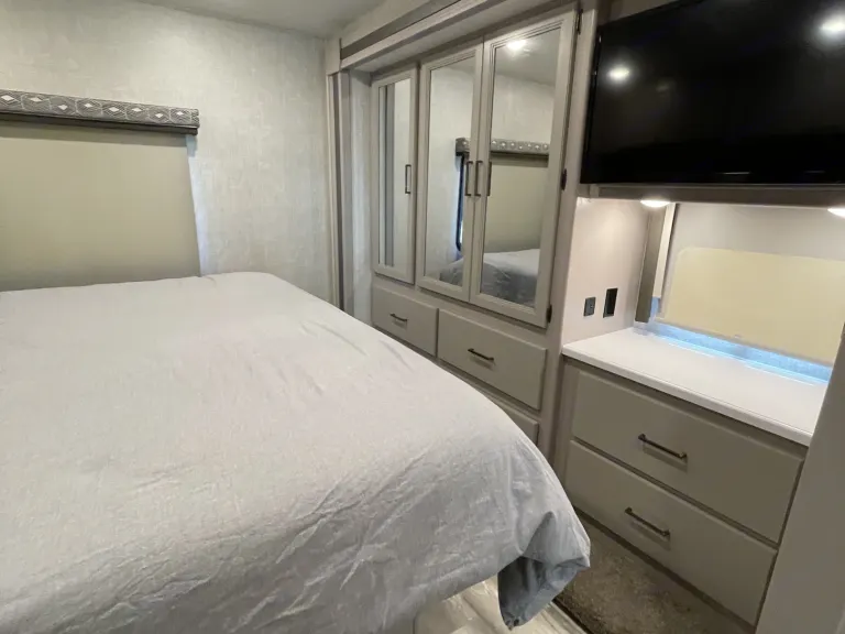 This the the ideal RV for family outings, Golf trips with the guys, Or the ladies weekend getaways. Our RV comes with everything you will need so we can take the stress out of your next trip! Fully stocked kitchen with dishware and cooking utensils and a Keurig coffee maker. Gas top stove and oven along with a microwave . This rig is jammed packed with high end components that will make you never want to give it back ( sorry you have too :) The rig is equipped with apple car play and a 10inch touch screen to help the drive go smoothly as possible. Auto leveling jacks with touchpad controls, Reclining captain swivel chairs for comfort and ease while driving or socializing with family and friends while on the road. Dual roofs AC to help keep the RV cool and comfortable. The bunk beds have a sliding door and tablet holders on each bunk to relax and kick back and watch your favorite show along with USB ports on each bunk. There are also outlets and USB ports throughout the RV to make charging all your electronics a piece of cake. There is a 32in TV in the master room with a king bed and a sliding door for privacy to really make you feel like you’re at home. The living room has a kitchen dinette that turns into a bed along with a hideabed sofa in front of a 39in TV. BlueRay player in living room. The RV is equipped with cable and Wifi and a fire stick as well. The outside components are just as impressive, Exterior 32in LED TV w/Bluetooth Soundbar & radio. Outdoor kitchen including fridge and sink. Awnings with LED lights and Lots of storage! We are Dog friendly with a refundable pet deposit. This RV is perfect for any trip! We hope you choose us for your next adventure!What's includedFresh linens for bunks and master bedroom as well as for the drop down full bed.