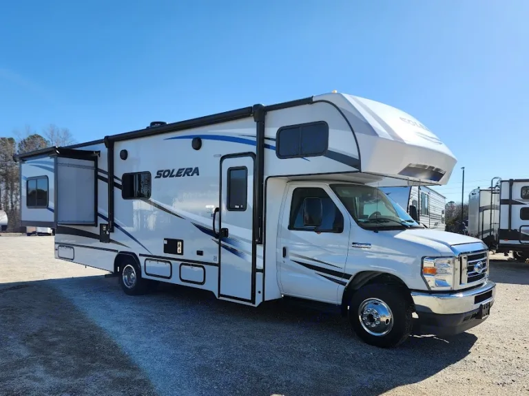 This beauty is a brand new Solera Class C motorhome with interior finishes that'll make you feel right at home. Comfortably sleeps 6- one queen bed, one full (above cab) bed, a pull out sofa and a dinette conversion bed. Very nice size fridge, microwave convection oven, stove, Keurig, toaster, pots and pans, utensils and dinnerware included. Plenty of storage space in kitchen, including a pantry. Bedroom has storage space above bed as well as a closet with hanging space. Another large linen closet next to the couch and storage cabinets lined above the couch. Flat screen tv in main area. What's includedComforters