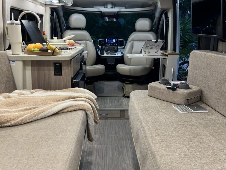 So it’s surprisingly Spacious and of course super cozy. What is great is that no matter if you are traveling with your partner, your parent, or your paperback this can suit your needs. The main cabin is an open plan with the bathroom in the rear and kitchen behind the driver which makes it easy for 2 to be. The van is climate controlled to keep you comfortable no matter the weather. The large windows provide stunning views, making the journey as enjoyable as your destination.The “living area” transforms from your living space to 2 twin beds or 1 queen. Bring your own bedding or you can add on the linen package. In between the beds you can set up a table to enjoy dinner or play some cards. Leather driving seats swivel around to create even more seating and a great place to work with a hidden desk that can also be utilized as a kitchen.You can cook or not - you choose! Cooks will love that this van has a two burner propane stove for that morning coffee that just tastes better when you're on an adventure or use the microwave/convection oven to cook a meal after a long day. Stock up the fridge for your adventure - plenty of room for your meals and fresh fruit and drinks of course! Small freezer also. Want to take the heat outside? Cook outside on the fire or we have an extensive kitchen upgrade “really cooking’” add on available that includes a 2 burner outdoor propane stove.Enjoy the convenience of a full bathroom with a shower, toilet and sink indoors as well as an outdoor shower for those beach days. Bring your own towels or add-on linen package whatever works for you! Hot showers are a necessity!! This model has 27 gallons of fresh water!! So be mindful but go ahead and shower. * Surprisingly more water is often used cleaning dishes.* A toilet is a must for most. You do you - some do #2 elsewhere that’s up to you!The van also includes oodles of storage space for all your gear. Our web-site Spruce and Sand has lots of pictures if you are a visual organizer. We do have a bike rack add-on if you are interested and for Lots of space we do have the monster of storage containers as an add-on.