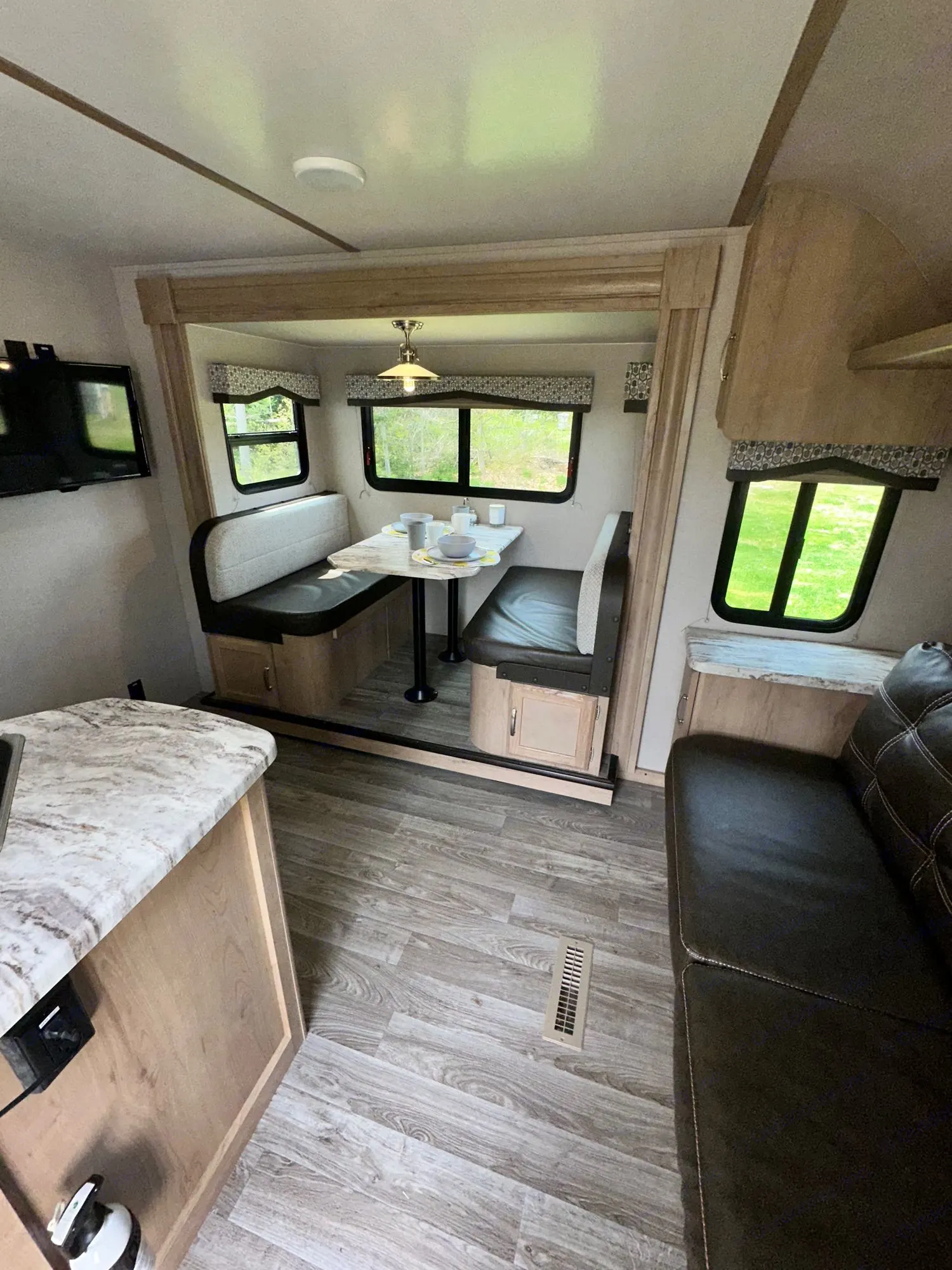 Book an unforgettable Maine adventure in this 28ft travel trailer - completely stocked for your trip to have you prepared for all Maine has to offer. This camper is a modern, spacious travel trailer with plenty of room in the bedroom and two extra beds (dinette and pull out couch) for kids or your company - or even fur babies! All leather and hard wood floors, it is a great option for all. Complete with a small stove, oven, microwave, fridge, heat, AC, outdoor shower for cleaning or dogs, and Lots of storage for all your toys and necessities. Full awning, with LED strip light, bluetooth speakers inside and out. We also provide a handy binder filled with helpful tips and instructions to keep things running smoothly during your trip. What's includedCookware, plates, cups, utensils, linens, matches, lighters, basic cleaning supplies, trash bags, fire extinguisher, 2x camp chairs - more available upon request with feeRecommendationsAs an all-season travel trailer, "Minnie Maine" is prepped for all types of adventures. We love Acadia National Park and experiencing the charming feel of Bar Harbor if you're looking to explore Maine's coast. If you're looking to head a little further north, there is a lot to be seen in the Moosehead Lake and Mt. Katahdin region. It not only is beautiful in the summer, but even more so in the fall as the leaves turn red, and the wildlife makes an appearance. Try your chances at seeing a moose, loons, deer, and bald eagles in the wild. Other things to noteBooking for something special? Kids vacation? Couples retreat? Beachy getaway? Let us know, we would love to make this experience personalized.Looking to have something else stocked for when you arrive? Simply let us know and we will see what we can do!Pets welcome!We do not allow smoking of ANY kind. This will result in additional fees as well as losing the deposit. We take pride in our equipment and the work we do the maintain the cleanliness of it.
