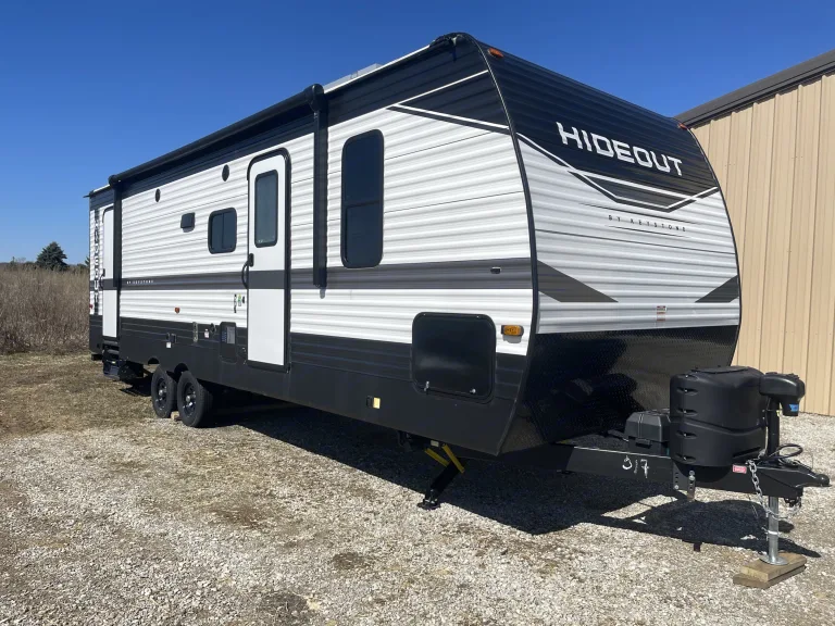 Brand new 2022 Keystone Hideout. Equip with a queen sized master bedroom, full size bunk beds and tons of storage for your camping adventures! LED retractable awning, and vacuuming system for easy clean up of dirt and messes. Use the back door for easy access to the bathroom to clean up after fun days outside!