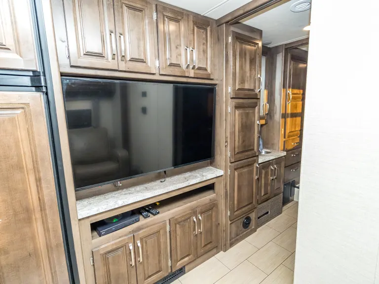 Driving in custom captain chairs is a breeze with GPS, a rear camera and driver and passenger door mirror cameras. Upon arrival, you can level and settle in with the touch of a button with auto-levelling jacks.Live in comfort no matter what climate you're visiting with two heating/air conditioning units, a generator, electric and gas hot water heater, electric and gas refrigerator. Get the party started with interior and exterior surround sound, and keep it going into the night with the LED light lined awning. A large TV with DVD player is across from the reclining oversized bucket seat couch and convertible dinette that sleeps two. The overhead bed sleeps two, too!