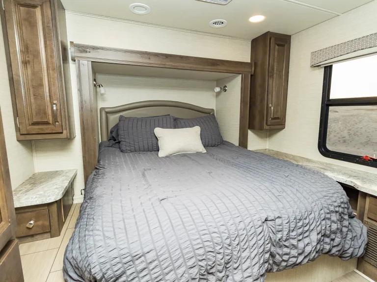 The spacious master has a comfy queen sized bed, closet-like cabinets, a TV with DVD player and is flanked by two sets of pocket doors for privacy.