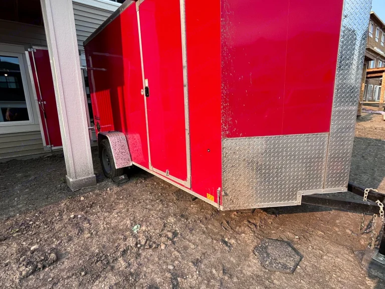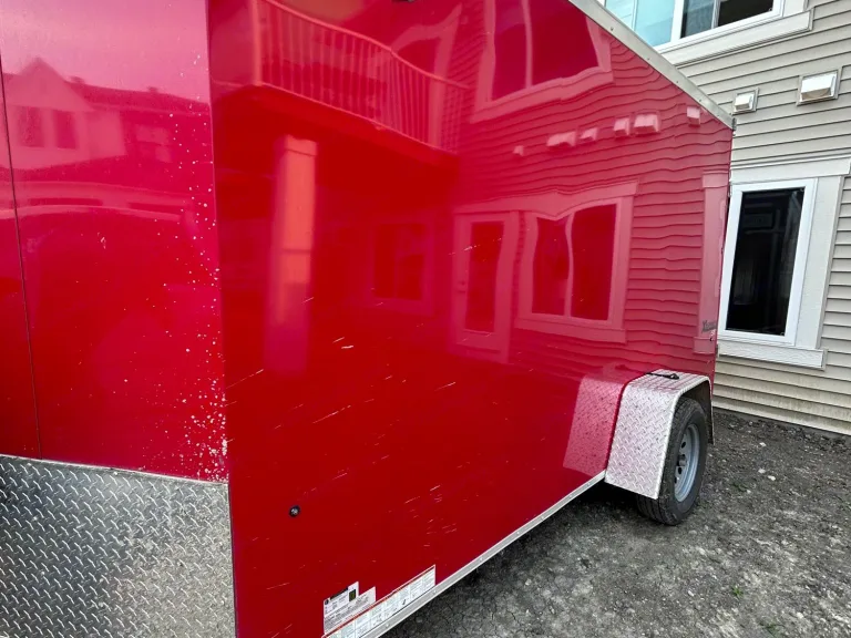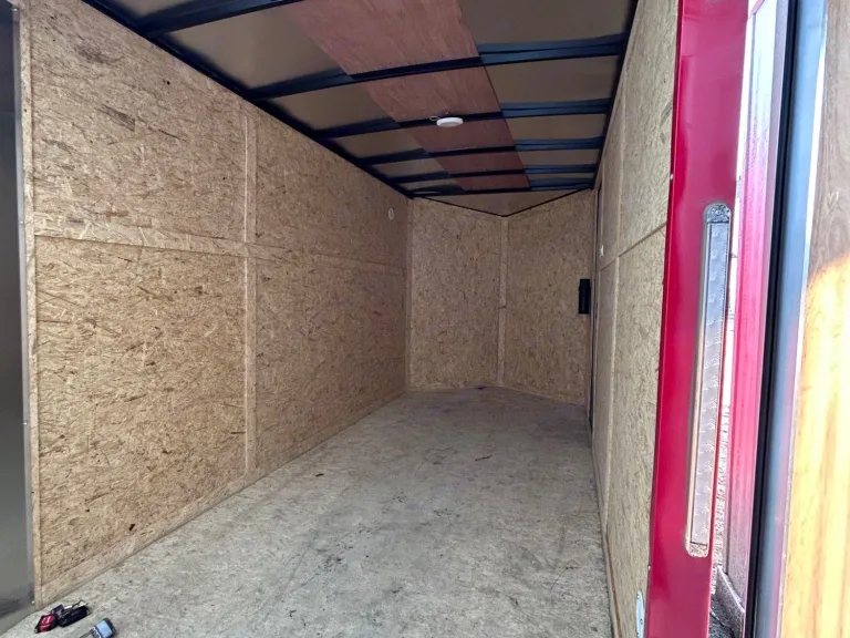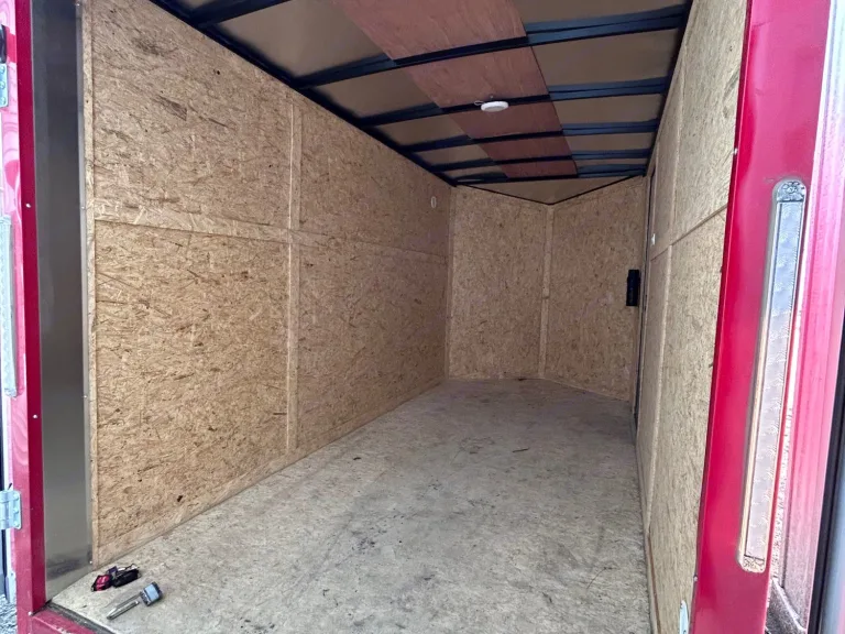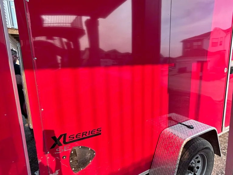 Rubix is 6x12ft enclosed cargo trailer with double barn doors.6" Extra height for a total of 78" interior height! Stunning in red, screwless exterior. 24" sloped v-nose, 2990 Gvwr.Single 3,500lb axle, 2000lb top wind jack. LED dome light and 2 sidewall flow through vents.