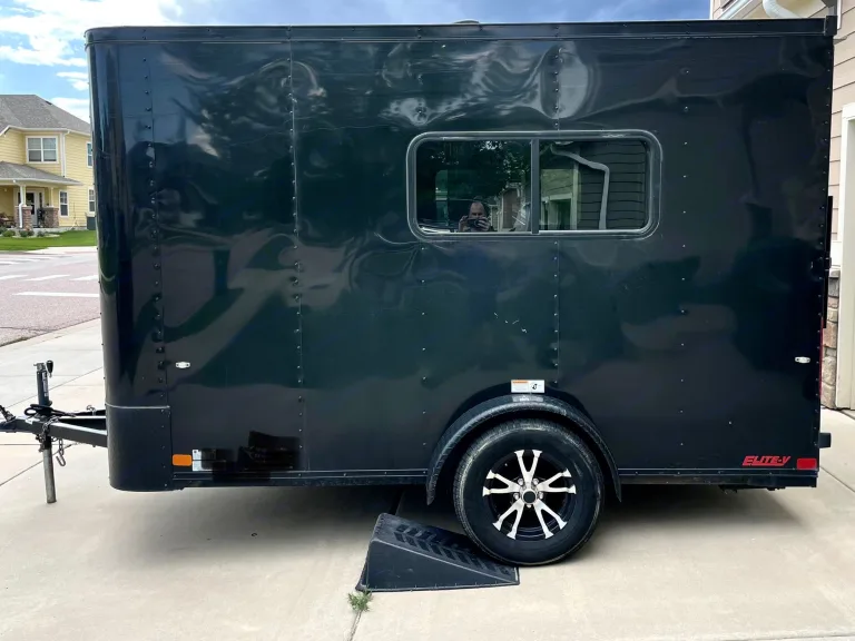 The perfect cargo trailer! 7 feet wide, able to hold 4 dirt bikes at one time with the Bolt It On Rack system. The interior is 80.5 inches wide and 78.5 tall. Pulls like a dream. Does not sway or bounce at highway speed. The windows and roof vent provide airflow if you want to camp. The walls and ceiling are insulated to help keep the trailer comfortable for a night of semi-glamping fun. The floor is durable and easy to clean. There are stablizer jacks built into the rear of the trailer the trailer from bouncing and doing awesome wheelies in the driveway. There are two incredibly bright interior lights that help you work through the night. What's includedAvailable accessories:Bolt-it-On rack capable of securing 4 dirt bikes or one large bike.