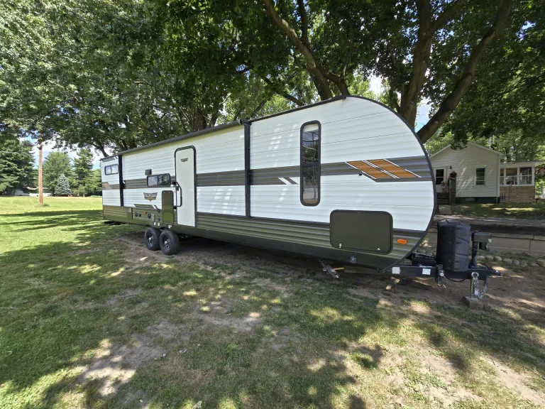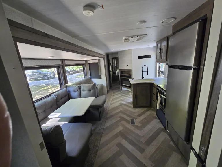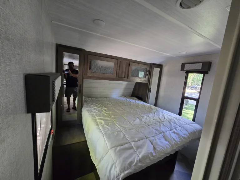 Very clean and spacious RV offering 4 separate beds-two twins and two queens, plus extra areas on couch and kitchen table area. It has a “master” room on one end with a queen bed and door for privacy. On the other end is a room with a sliding door . It holds a large bed on bottom with two twins on top. Also, the back room has its own door going outside. It’s perfect for a large family or two couples to enjoy their own areas. This is for delivery only, NO Pick-UP.Other things to noteNo smoking, small pets welcome, delivery only.