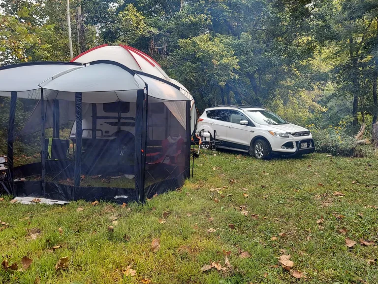 Includes awning, 10x10 canopy, camping chairs, a gas grill and charcoal grill.