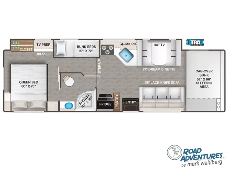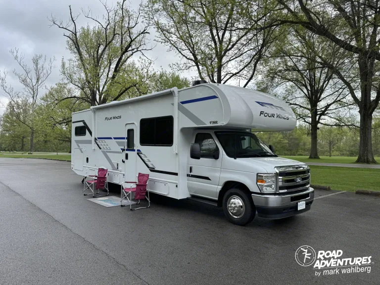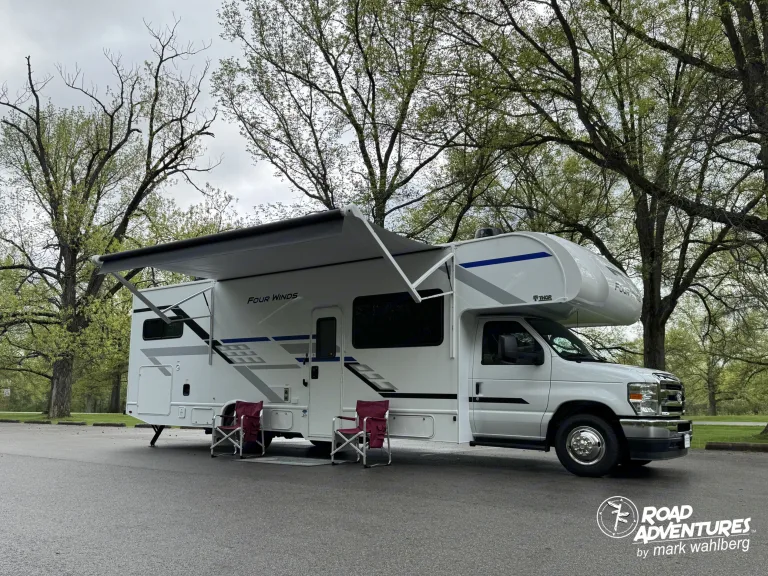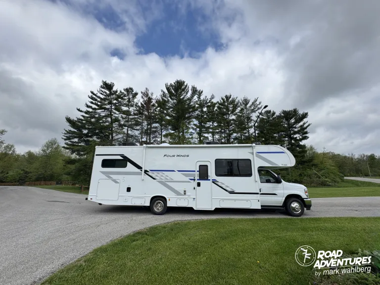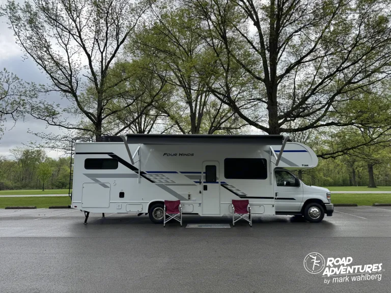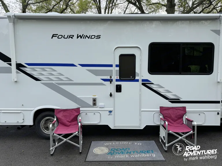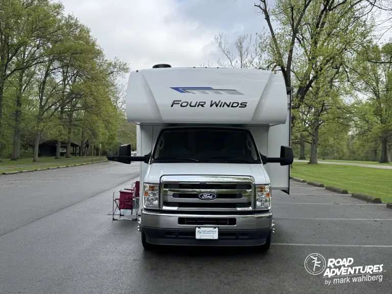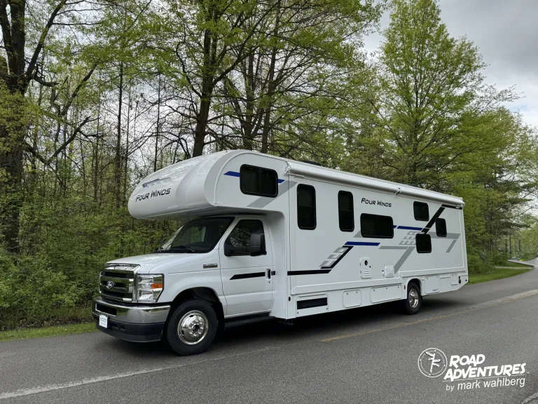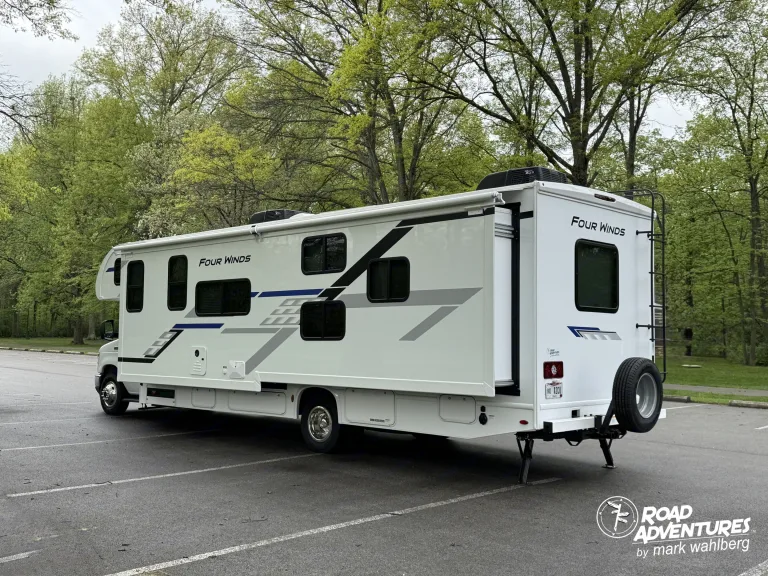 The Thor Four Winds 31EV is our largest floorplan. It has a queen bed, a full-side slide-out, a 71" Dream Dinette, a 68" jack-knife sofa, and bunk beds. With 7 seat belts and sleeping up to 9 people, this 32'8" RV is a great option for your next adventure.