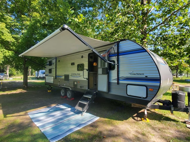 *Approved to Deliver to Michigan State Parks!*Our 2020 Coachmen is fit to sleep 8 to 10 people comfortably and with 1 large slide out there is ample space to move about or even enjoy TV/game time inside! It has a private room with queen bed, and plenty of storage. The rear bunkhouse has 3 single bunks and 2 foldout chairs so your kids or friends can enjoy their own space. The couch also folds into a bed. Enjoy our fully stocked kitchen with fridge/freezer, microwave, stove with 3 burners and oven, Keurig coffee maker, pots/pans, plates, bowls, eating utensils and cooking utensils. The bathroom has a shower/tub and is stocked with towels and toilet paper. You will love the outdoor speakers and Bluetooth radio while you relax near your campfire or cook on the outdoor kitchen with mini fridge. The camper also has an outdoor shower, perfect for the sandy feet to be washed or to simply rinse your used pots and pans. Power awning included for relaxing in the shade.Check out our other listings!