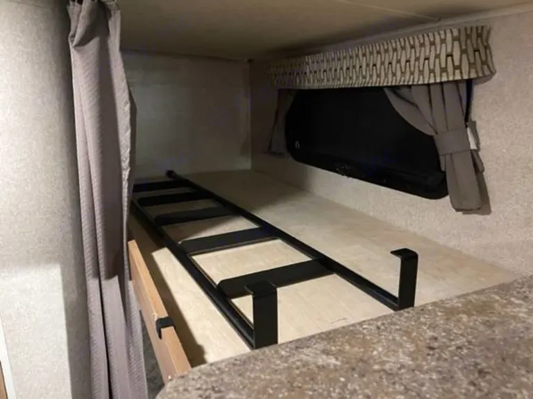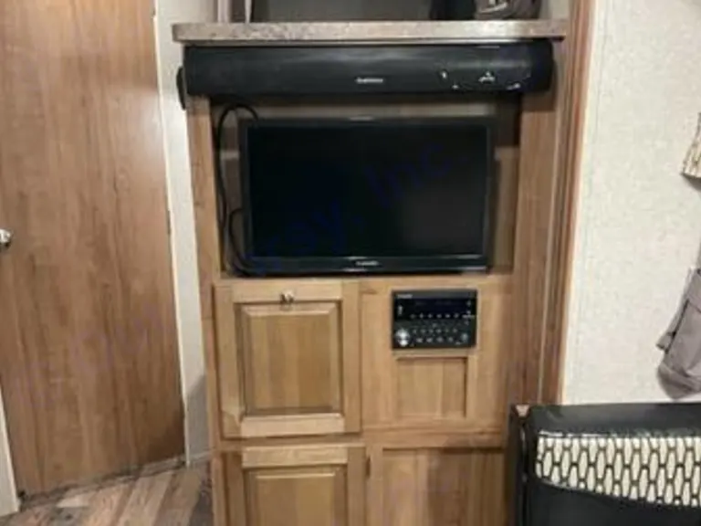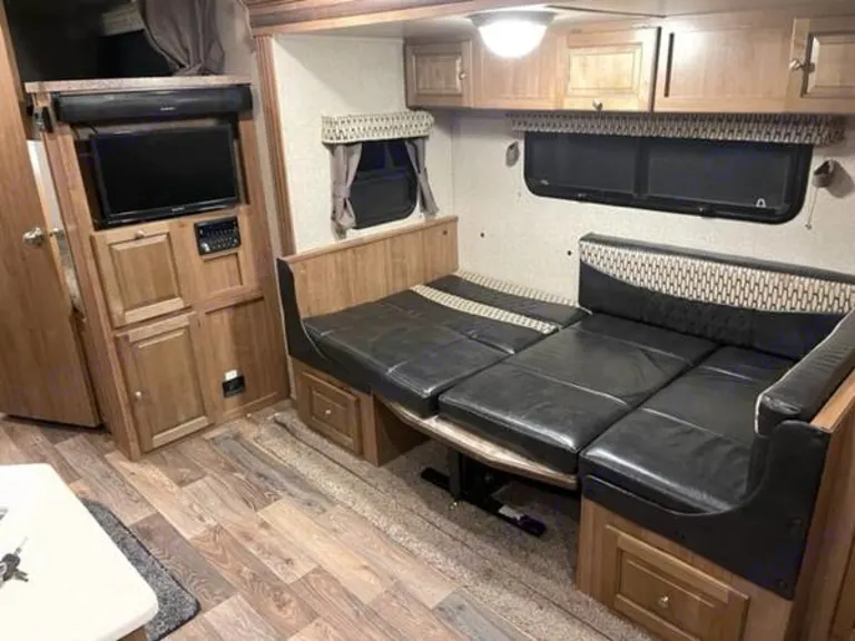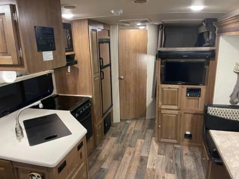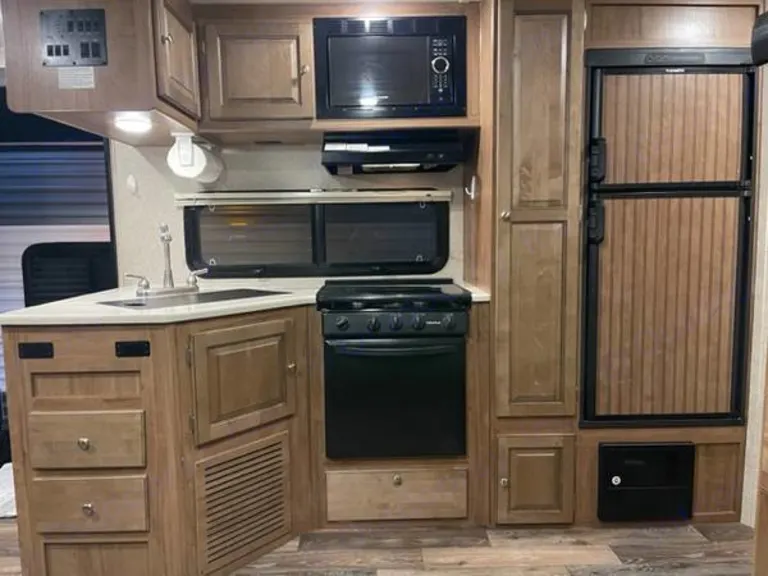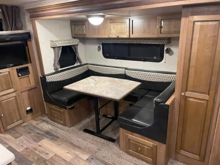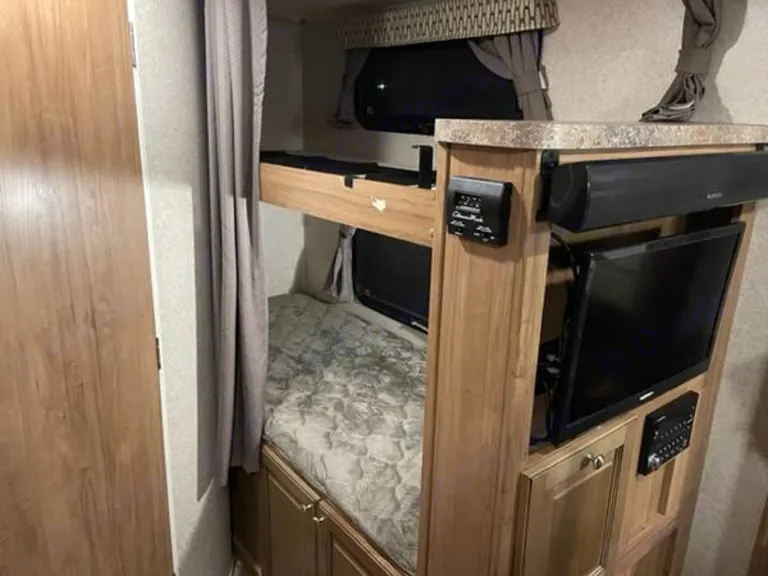 Our RV has been our weekend home for years. Our son learned to walk and our daughter learned to ride a bike on these monumental weekends we’ve enjoyed in this trailer. It has 1 big electric slide for the dinette, a tv and dvd, bunks for the kids and a full kitchen. A/C works great, electric awning outside. Bluetooth/dvd/fm stereo with outside speakers. Also a Murphy bed that folds up in the wall to make more room. Plenty of cabinet space and a bathtub for the kids.