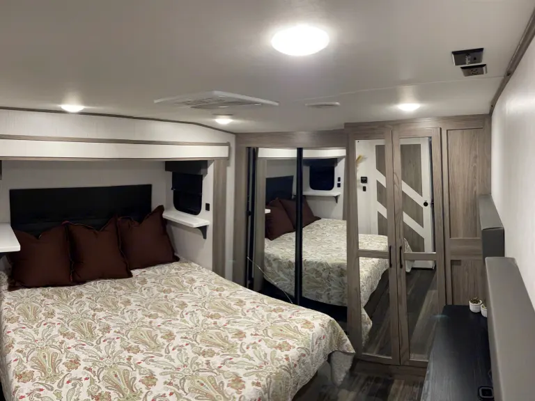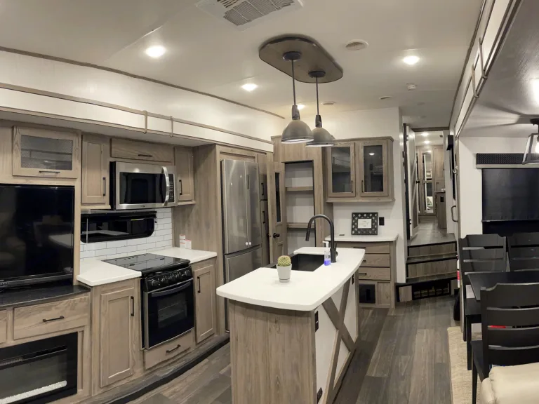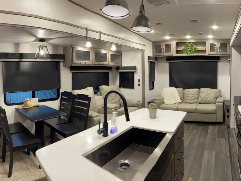 Luxury camper with farmhouse feel. King sized bed in the bedroom with large closet. Sofa folds out into a bed. USB charging ports throughout the camper along with two wireless charging pads. Large farmhouse sink with residential sized fridge. Huge flatscreen TV with remote. 2 air conditioners that blow very cold. Electric patio awning.