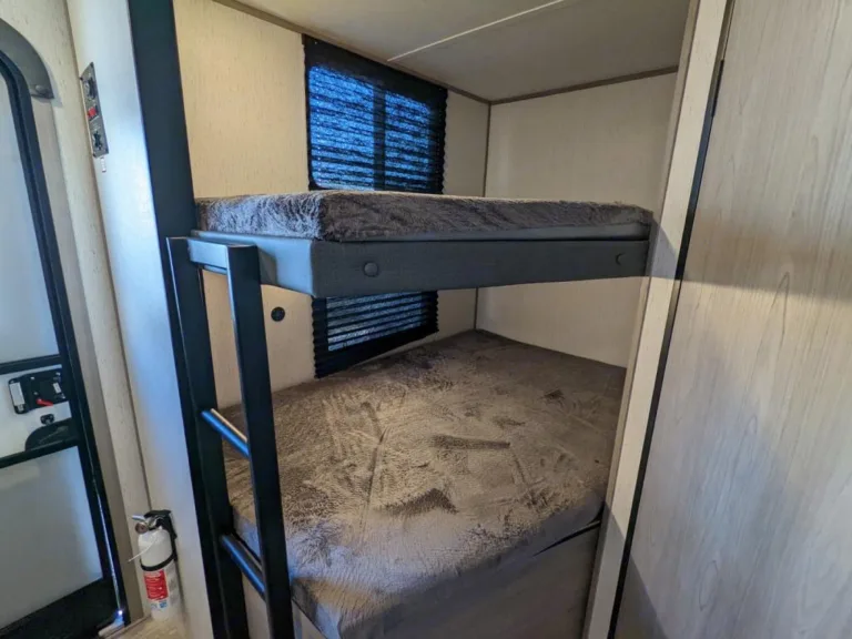Bunks are full sized and could sleep 2 small children each. But could also comfortably fit adults. Both bunks have an egg crate topper.