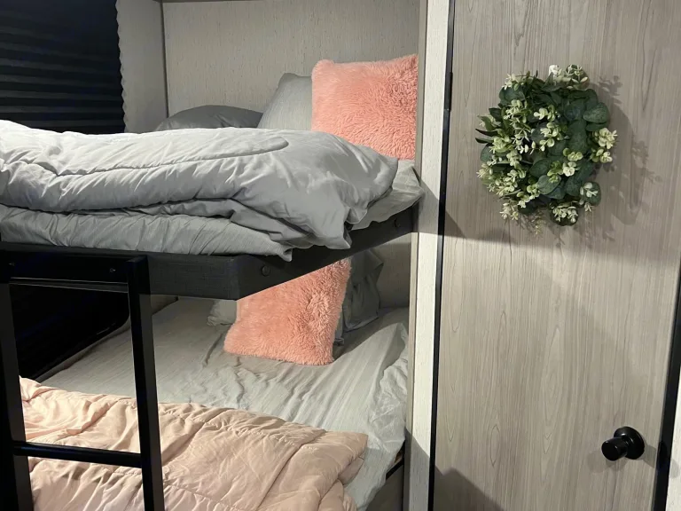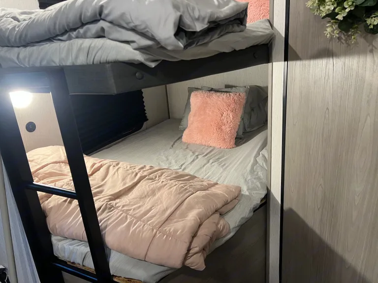 It comes equipped with more than what you will need for an easy breezy camping trip.Master has a queen size bed. And a 4” mattress topper.
