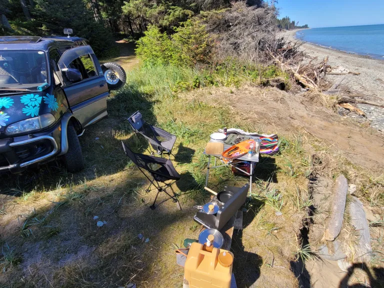 (Beach access not permitted)- Powered by a dependable diesel engine- USB charging ports- Unlimited kilometers on Haida Gwaii- Rennell Sound and Beach access is not permitted.Included With Your Rental- 12V electric cooler- Foldable table + camping chairs- All Cooking essentials (Coffee espresso, pots, pans, utensils etc..)- Stove setup includes 1 bottle of propane- Salt / Pepper, Coffee / Tea- Built-in awning for shade and shelter- Water storage for drinking, cooking, and cleaning- Lanterns, headlamps, and cleaning supplies- Safety items including a first aid kit, spare tire, and air pump- Bear Spray, Bug spray & Mosquito coils- Small hatchetOptional Camping Package (Sleeps 2 extra people)