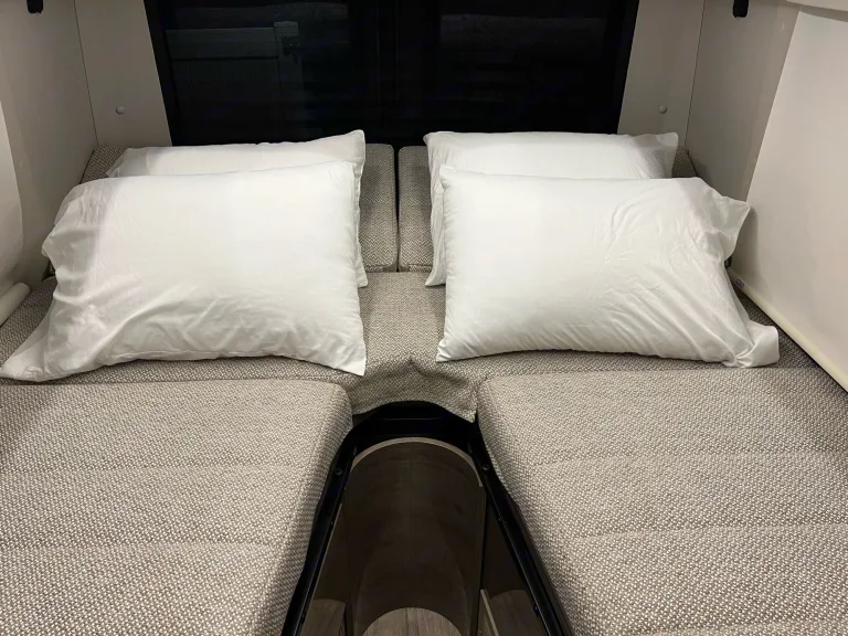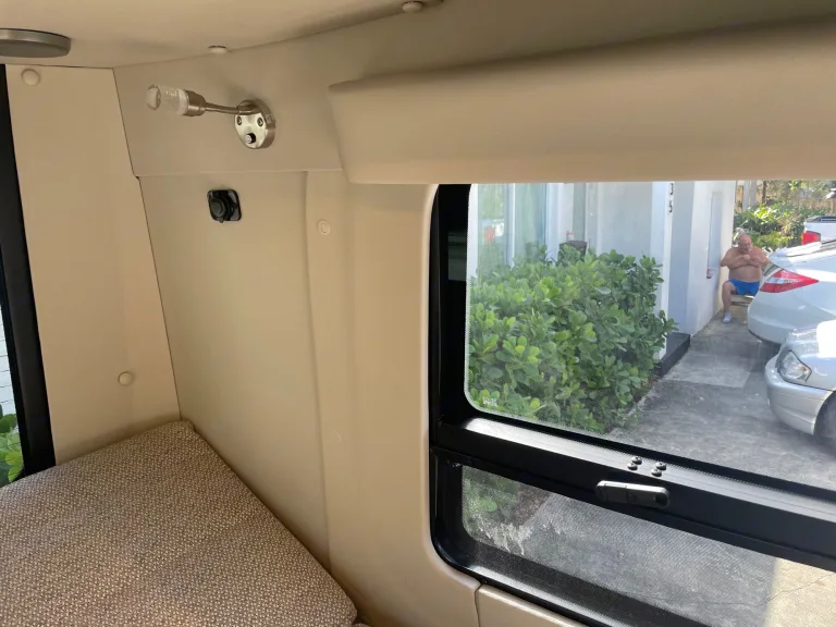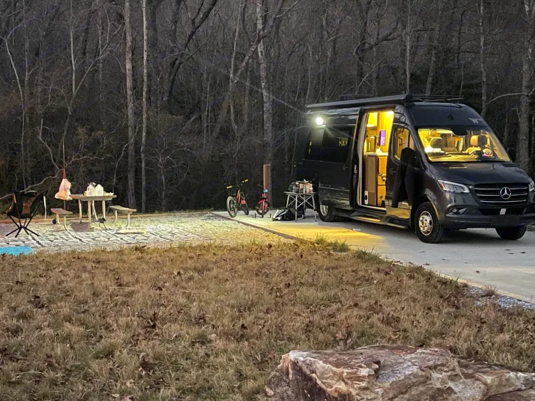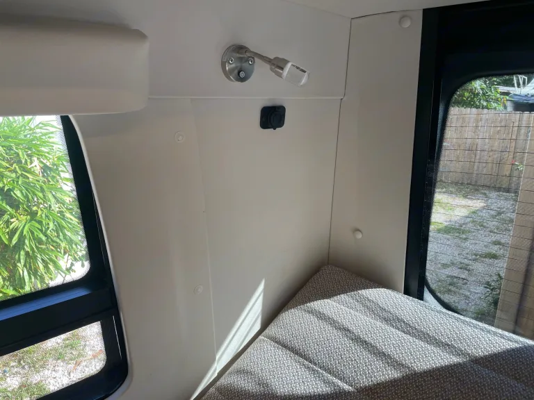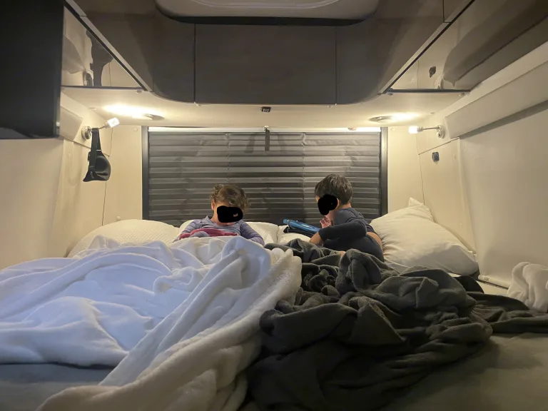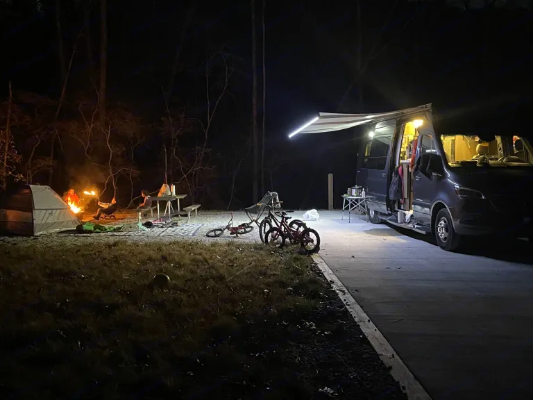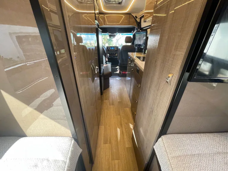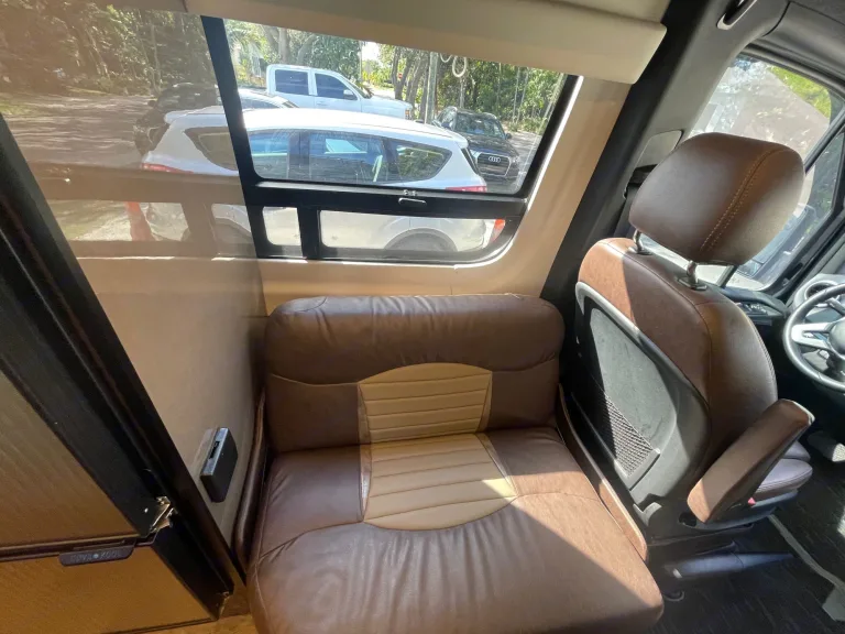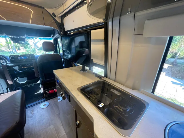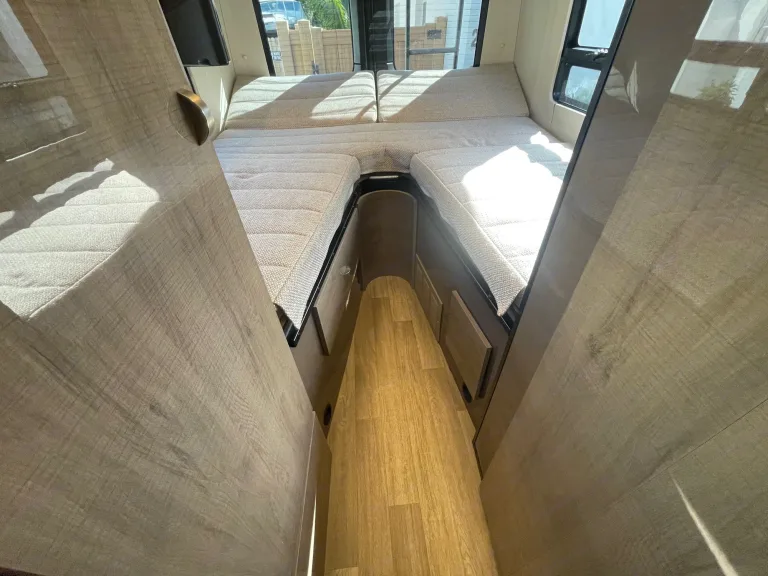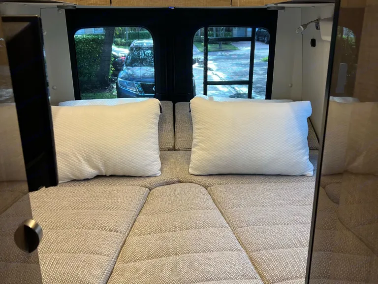 Camp and create extraordinary memories while You're in style and comfort.Adventure awaits you in this stylish campervan that can sleep four people each night. There are twin beds at the back that can convert to a 68" x 75" Flex king size bed and a 36" x 66" twin sofa bed up-front for a guest or two small children—rear camera. The Ultraleather cab seats slide, swivel, and recline once you arrive at your destination to become a part of the living area. There is a convenient removable pedestal table to enjoy your coffee each morning.**We allow you to use two nights at a campsite for free from our membership, if available on the days you are ready to go on your trip****Highlights**