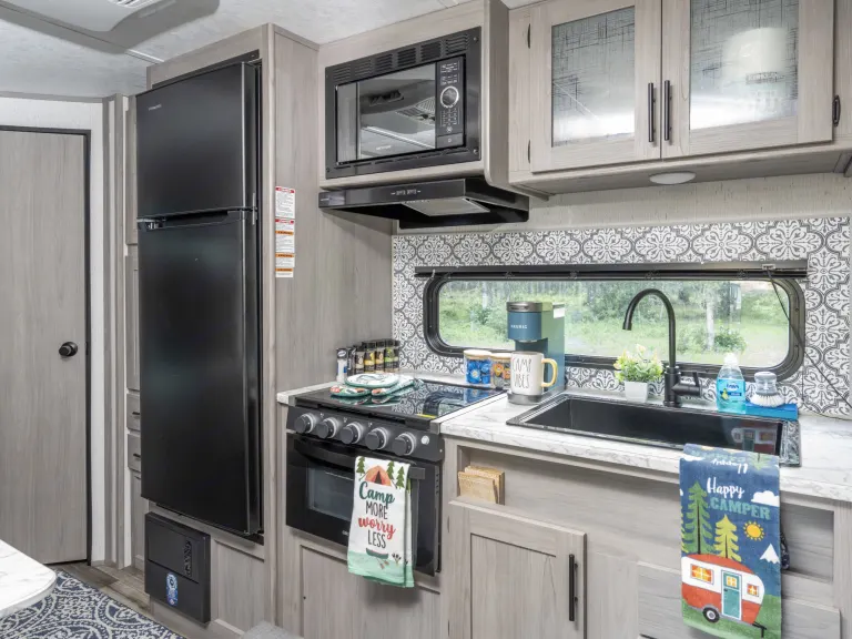 Enjoy the open road in comfort in The Happy Camper! The modern amenities and spacious interior make it an ideal renter for couples, families or a group of friends looking to make awesome memories. The happy Camper can accommodate up to seven people comfortably with plenty of room to spread out and relax. With an outdoor grill and fridge you will never be lacking in anything.-Available for Pick up or Delivery.