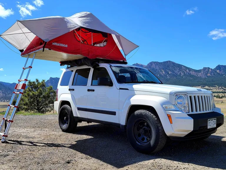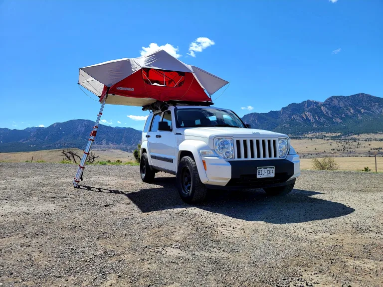 On top of the Jeep (we call her Kate) is a very easy to set up and very comfortable Yakima Sky Rise roof top tent, it has a nice thick memory foam mattress inside but if you need to sleep 4 people add the interior fitted mattress .