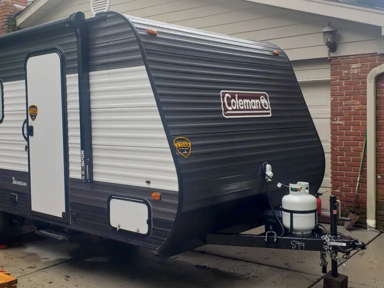 This is a New Coleman Lanter 17B. It's a small yet cozy RV with sleeping room for 5. This RV has a queen bed, a bunk area with2 beds, and a dinette conversion bed.