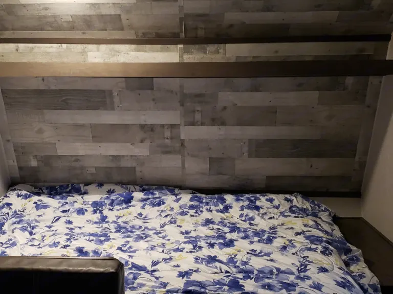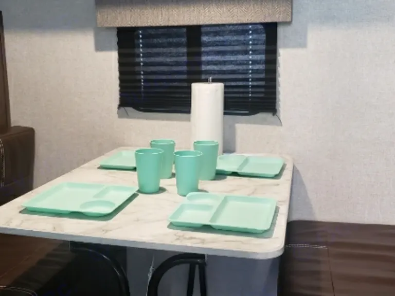 This RV comes with an awning for sunny days. What's includedFresh linens & pillows are included with this RV as well as 5 sets of plates, bowls, cups and utensils. There's a small Frying pan, spatula, sharp knife, & utility scissors too. There's a kitchen towel, a roll of paper towels along with a paper towel holder, a dish cleaning brush and dish soap. The bathroom is supplied with 5 regular size towels and washcloths and a bath mat. RV toilet paper is included. There's even body wash in the bathroom in case you forget yours.
