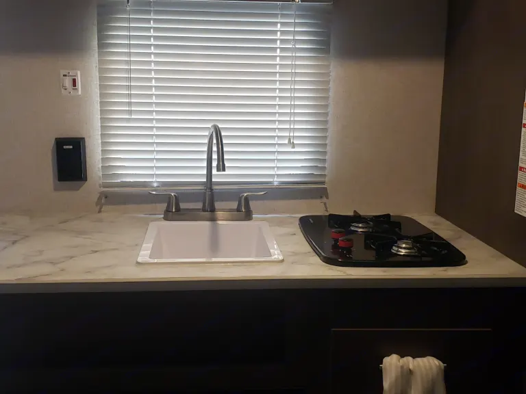 The kitchen has a sink and a 2 burner, propane stove top, a small refrigerator, and a microwave.