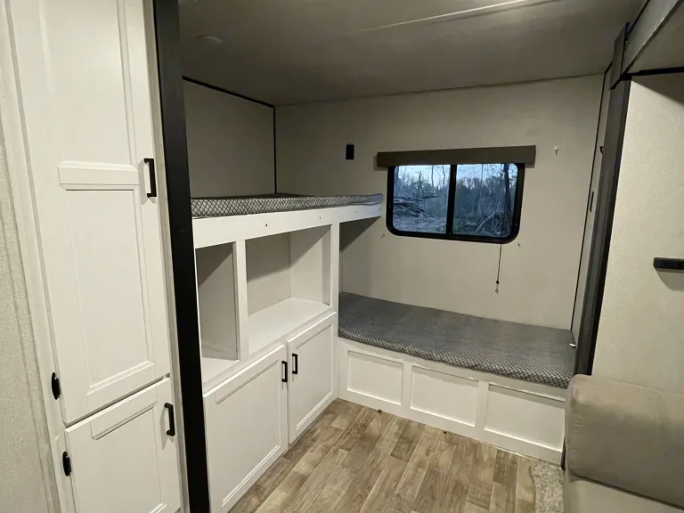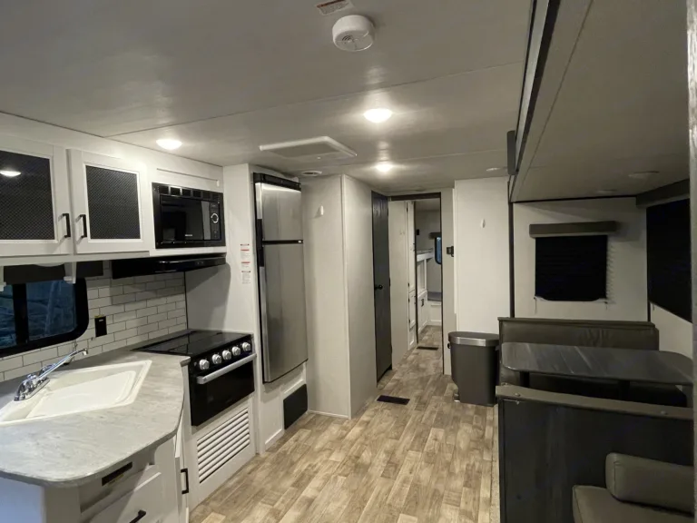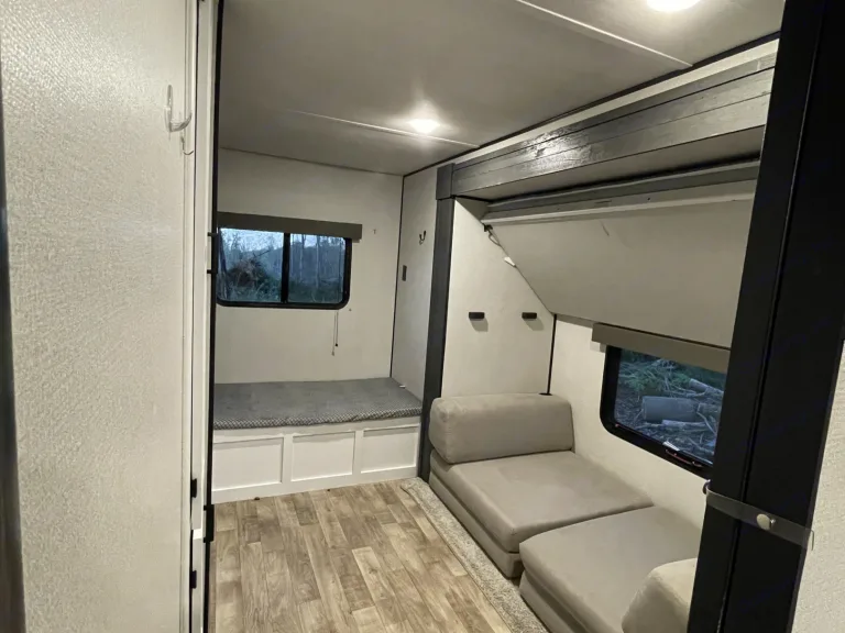 This rig sleeps up to 11! Spacious and clean travel trailer that truly is our home away from home. There’s a separate bunk room with 3 twin beds and a floor couch that can make another bed or be moved for more play area or a playpen for a smaller child. Queen master with double access doors. New 8” foam mattress in master. The dinette folds down and the couch folds out for extra sleeping areas.