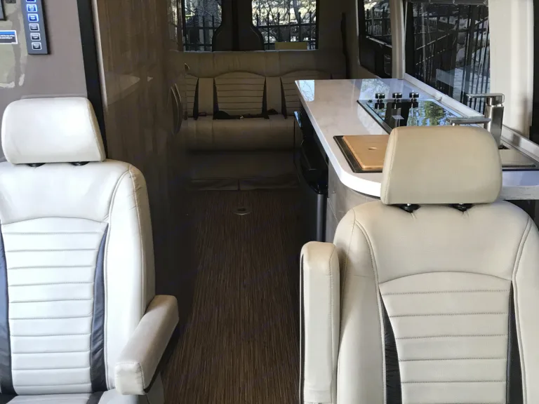 There are 2 captain chairs behind the driver's and passengers seats, and a back bench with seat belts for 8. The back bench can easily SEAT 3-4 normal sized children or skinny teenagers in the 4 seatbelts OR 3 medium adults comfortably. It automatically reclines into any position while driving and down to a wide almost king sized bed at night. The ERA is marketed at sleeping 2-3 (if you sleep tent style on the back bench).Our creative sleeping tips- The van is not marketed to do this but this is how we squeeze in if we all want to sleep inside. The front driver and passenger seats can recline completely and match up with the captain chairs in the main cabin to make 2 beds for children or youth smaller than 130 lbs and about 5'6 or shorter- they usually curl up when they sleep anyway! If you would like that option please select the "twin bed add on" so we can provide the leveling pillows and bedding. The ERA is not marketed to make these chairs into beds, but it has worked for us for short term trips.How we fit 7 (2 adults plus 5 kids ranging in age from 5-15): We can fit my husband and I and 1 of our LITTLE kids in the king sized bed (its a bit tight depending on how your little one moves when they sleep). 2 more kids on the combo front reclined & middle seats and our 4th and 5th child on the floor on mats. But honestly—we usually just throw the tent and hammocks outside the RV and let the kiddos fend for themselves while we sleep comfortably in the RV. Ha ha!Extras: