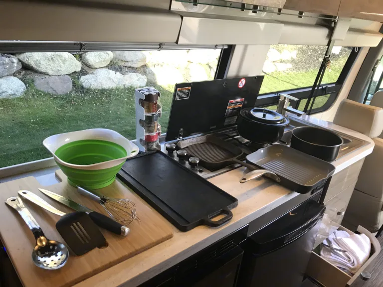 2 TVs, Hundreds of stored movies on our Mac mini (mostly family friendly or PG13 or lower rating) and a DVD player.Integrated inside bathroom with shower as well as an outdoor hose to spray down your kids before they get back in!Dually 4 back wheels for greater stability. Easy to drive and park. Huge picture windows offer wonderful views.Rear AC that can run off of a generator while driving when needed, propane thermostat heater, comfortable soft leather-like seats. Outdoor outlets for movies and music, automatic awning with lights. You can camp off the grid with the generator and solar. It is best to be plugged in when its an option so you don't eat up your generator gas.Kitchen has a 3 burner gas stove, sink, fridge with great storage, small freezer and convection microwave, included kitchen supplies 2 pans, 1 griddle, 2 pots, a bowl/colander, microwaveable dish, basic spices, spatulas, large spoon, fire starter, knives, cutting board, spray oil, olive oil, (you could even bake a cake if you really wanted to!) Please specify if you would like dishes and utensil (most do paper), specify if you would like the small kettle or coffeemaker (takes grinds).There are cubbies all around the cabin for everyone's gear (rent our hitch container for more storage).Seating and Sleeping: