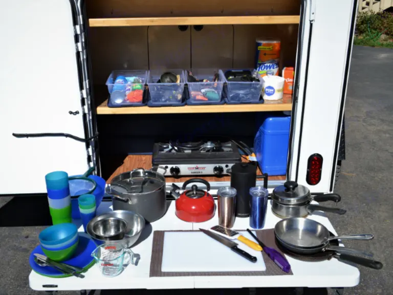 Upgrades cooking capabilities and comfort amenities with additional folding table, 2-burner stove (5 lb propane bottle included), all necessary cookware and utensils, food storage supplies, dish towels, cloth napkins, camp chairs, Goal Zero lantern and headlamps, mini electric space heater and more..