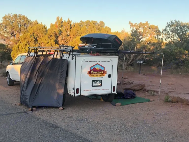 This lightweight unit comfortably sleeps 2 and provides ample storage for all your gear. The AT chassis is capable of exploring remote locations via unimproved roads and it can easily be towed by most any vehicle with a Class II hitch and a 4-pole light connection.Equipped with a Full-XL sized convertible sofa-mattress and a solar charged 35 ah battery you will a have secure, comfortable place to recharge all your batteries in preparation for your next of day of adventure. Hiker 001 provides great comfort and exceptional mobility that gives you the freedom to explore further than the majority of your over-sized 'glampers'. We offer several outfit options that upgrade cooking and comfort amenities as needed.Standard cleaning fees are included and there are no extra charges for pets. This unit does NOT require a brake controller for towing.What's includedOur Basic outfit comes standard with a roof rack mounted awning and a NEWLY ADDED shower/changing station with a portable shower, Full-XL convertible couch/mattress, 35 kwh AGM battery with 50 Watt Solar charging and multiple USB/12v outlets, folding table-w/ adjustable height, flatware/silverware, can opener/bottle opener/corkscrew, outdoor carpet/camp ‘lawn’, stakes and hammer, and all essential cleaning supplies. Water jugs and chest coolers provided at no additional cost as needed.We provide Free Delivery & Pick-up to locations within 10 miles of Durango.RecommendationsThis unit will enable you to move easily and efficiently across the Southwest region without killing your gas mileage. The roof rack and receiver hitch enables you to bring the gear you need to make the most of it!Upgrading to a Deluxe or Premium outfit package allows you to easily add complete cooking essentials and comfort amenities so you have less to worry about packing, and can get on the road faster.Other things to noteAll our rentals are NON-SmokingPets are welcome at NO ADDITIONAL COSTNO ADDITIONAL CLEANING FEES when returned reasonably cleanUnlimited mileage included with all rentals
