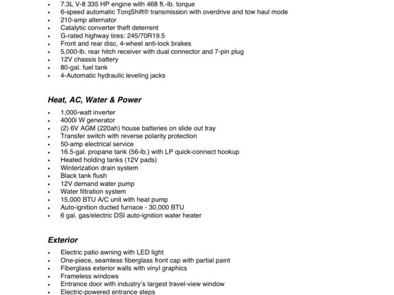 • Equalizer System with 4 automatic (if slope is not excessive) hydraulic leveling jacks — setup at camp is as simple as pushing a buttonStress-Free ExperienceWe provide everything you need: cookware, outdoor chairs, and a full walkthrough before your trip so you feel confident hitting the road.Special SavingsWe are proud to offer a 10% discount for First Responders & Veterans — message us for your custom rate.We also offer extended-stay savings: