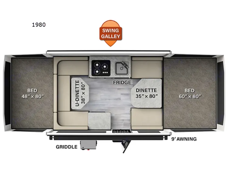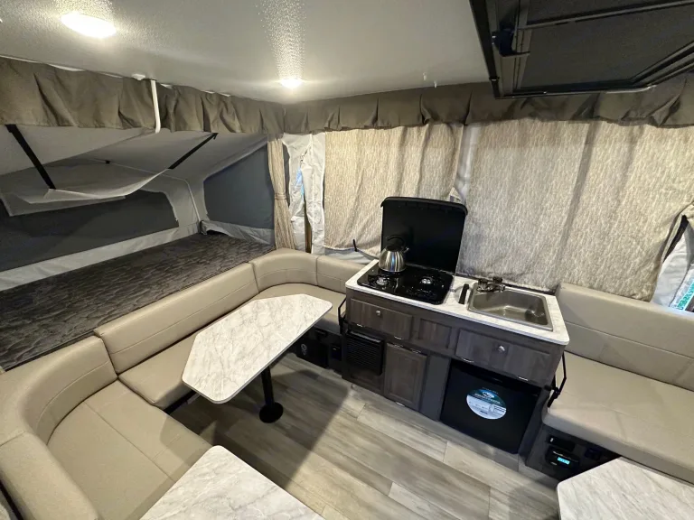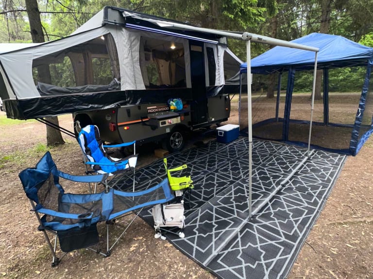 Make sure you are browsing in the correct site! For Canada please use .caNew 2023 Rockwood Freedom 1980Take advantage of this fully equipped family friendly tent trailer. The perfect rig for family getaways or a couples weekend. Sleeps up to 6 people comfortably. One double bed, one queen and two dining areas that turn into beds. The double and queen are both heated mattresses for those chilly nights. You’ll find the trailer spacious with two dining areas. One to hold the snacks and one for the games. Do all your cooking either inside or outside on the griddle.Open to festival use.For the newbies, the weight is 1915 lbs. This means it can be pulled by most vans and SUV's. Please check your manual. The hitch weight is 255 lbs. You'll need a 2'' ball & a 7 pin connector. We can provide the hitch that includes sway bars, which makes it safer to drive.We have many tutorial videos to help your setup & will always be a call away to assist. It is pretty straightforward as it is automated lift.It comes with two propane tanks, 30 amp cord, solar panel, 9' awning, outside shower and much more.What's includedEquipped with: