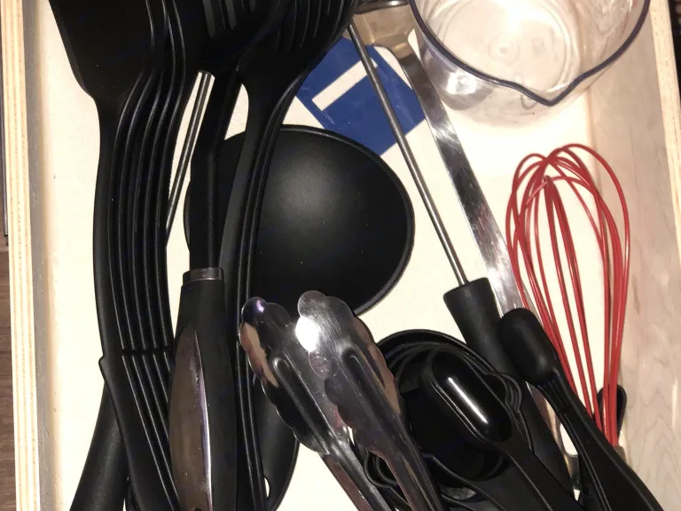 TpDrwr- Set for 10 flatware, Canopener, pairing knife, Chef Knife, bottle opener, measuring spoons,