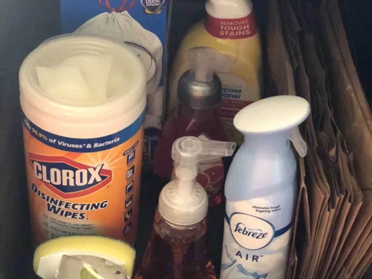 Lysol, Dawn, Clorox spray, Glass cleaner, Clorox Wipes, Febreze spray, Black Tank Chem