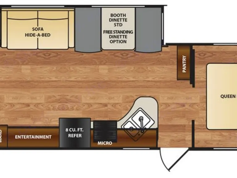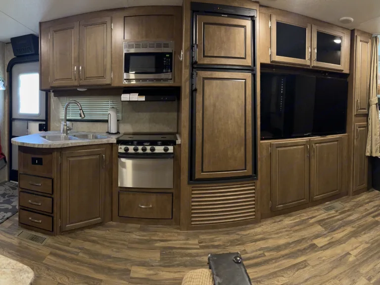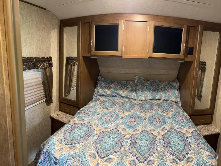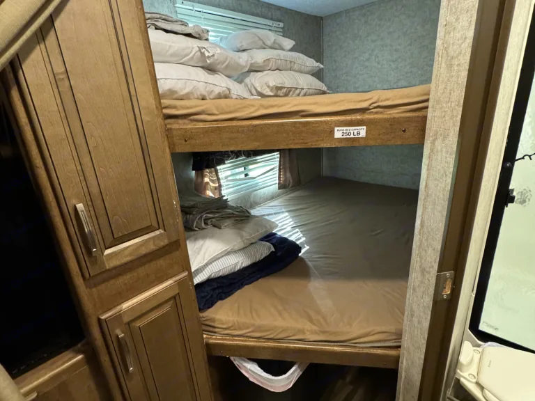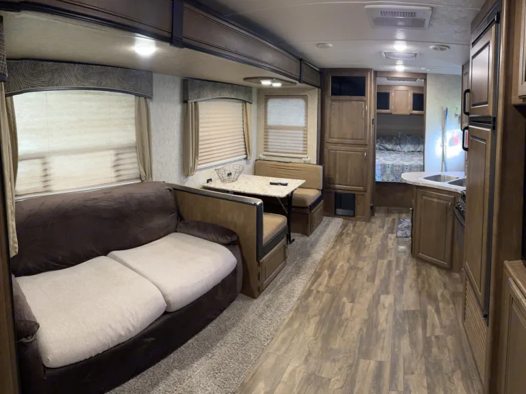 This little home away from home is well maintained and clean. It will sleep 4-6 campers, comfortably. The queen bed up front can be closed from the rest of the camper with a second AC as well. There are two sleeping areas in the kitchen area (pull out couch and dinner table) as well as bunks. Also comes equipped with fridge, microwave, stove and shower. The outside has a mini fridge, sink and hot plate. What's includedFresh linens on beds, as well as some toiletries and towels. Feel free to bring extra blankets, pillows and any other personal items you may need.Other things to notePlease, no pets or smoking. Remember to clean up when your trip is complete, and leave camper as you found it.
