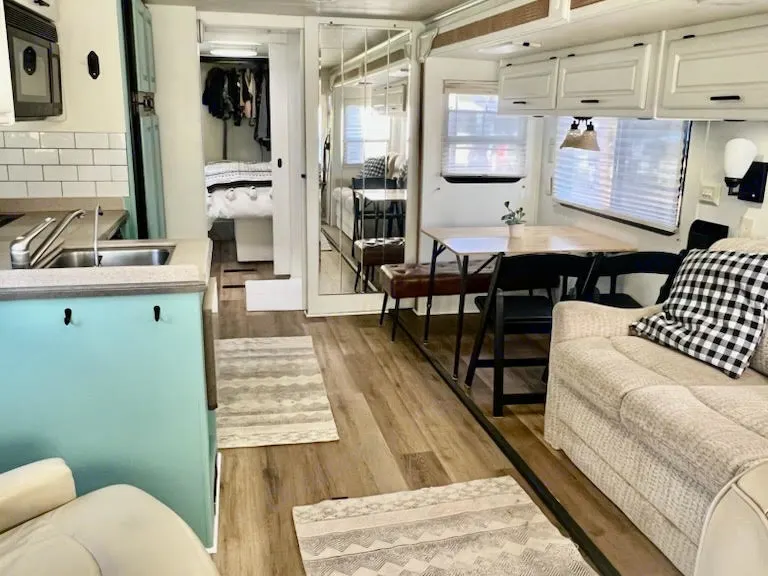 Beautifully remodeled interior with new flooring and paint throughout. Comfortable sitting areas, satellite TV, DVD players, and more. Sleeps 3-4. Very easy to drive, or I can set it up at your campground for you! Automatic leveling, full hookups with 50 or 30 amp service. Filtered water system, AC, heating, full shower and bathroom facilities. What's includedIncludes chairs, propane grill, propane outdoor fire pit, tent, exterior mats, linens/pillows/blankets, outdoor folding table, twin air mattress. RecommendationsThis is great for beach or mountain camping! Other things to noteWe can deliver and set up the RV for an additional fee:) No smoking inside the motorhome and festivals must be pre-approved.