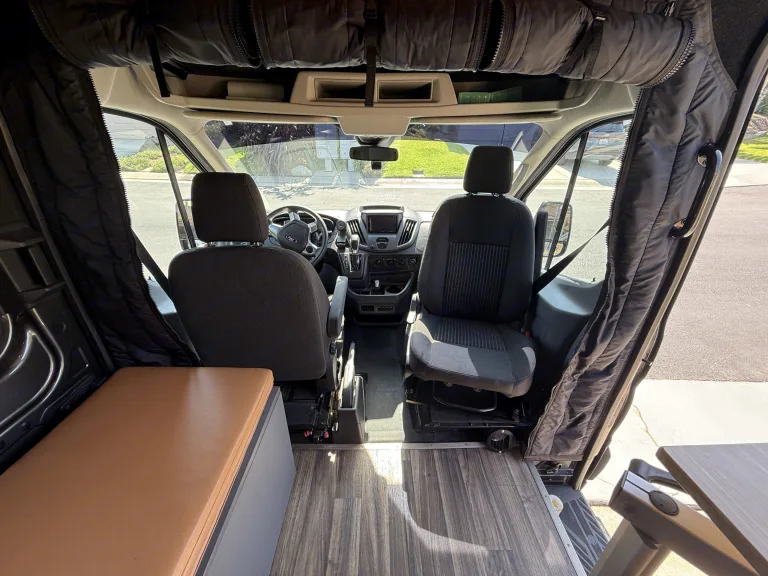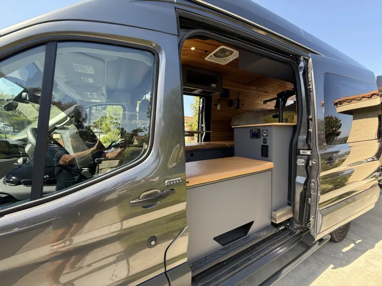 Fully-equipped for adventure, includes solar, full kitchen, full-size bed, dual sliding doors, - all you need for a Southern California coastal getaway. Sip Prosecco and watch the sun go down in Cardiff while you sit in the rotating captain’s chair and eat charcuterie.Enjoy sunset on the beach with the included Solo Stove and camp chairs.Additional Luna Bed for cab sleeping allows a third smaller person to sleep comfortably up front What's includedFresh bed linens and pillows