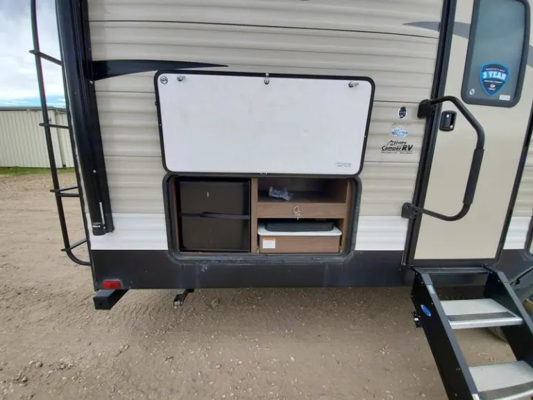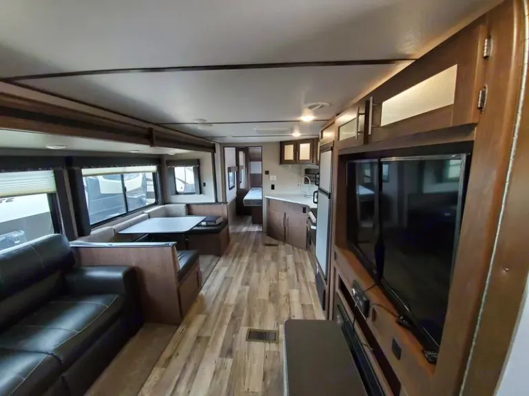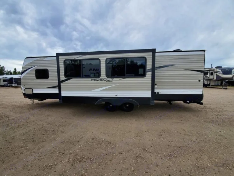 Our 2019 Hideout is 35 feet overall with one superslide and very large TV plus all the extras listed under highlites. This beauty has all the comforts of home packed in this RV, including an out door fireplace and outdoor kitchen.What's included• 32 Piece dish set, 8 large plates, 8 small plates, 8 cups, 8 bowls