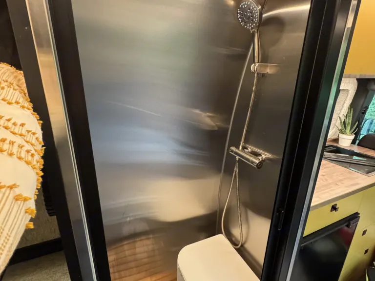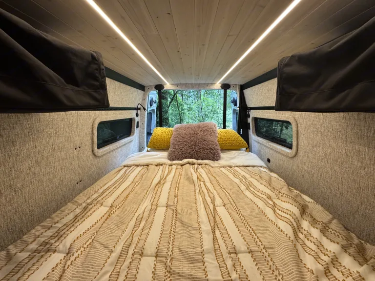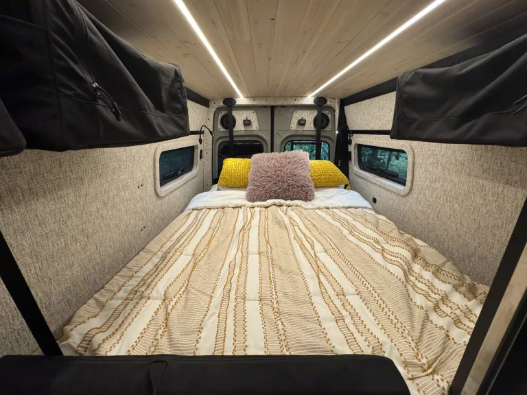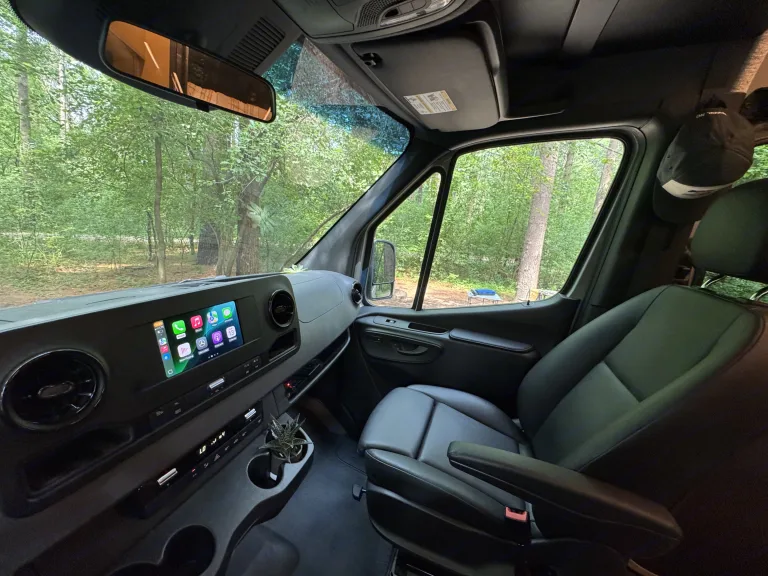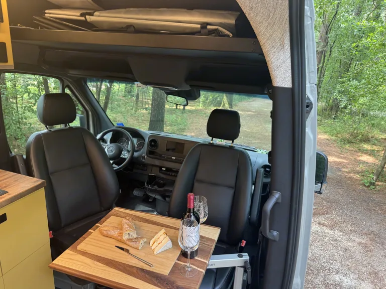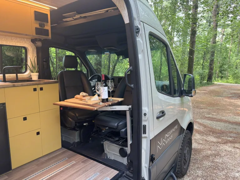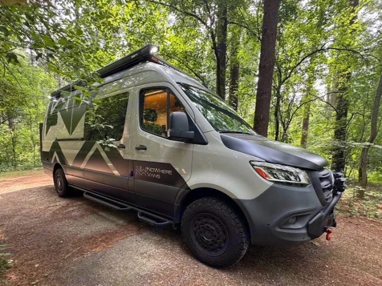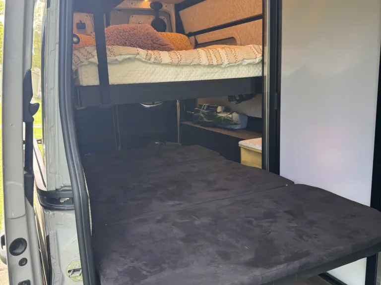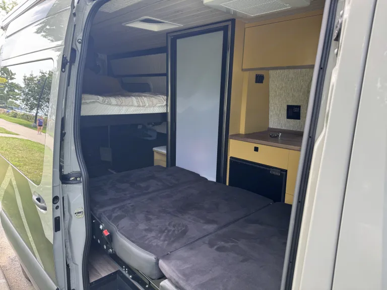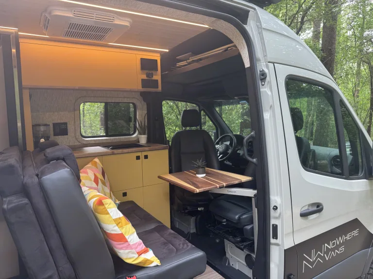 "NoWhere Vans Huron" was custom made by NoWhere Vans in Elkhorn, Wisconsin as their demo van so it includes every feature they offer in a custom van.The Huron seats 4 with certified seatbelts and sleeps 4 on one queen-size powered-lift bed and one double-size bed that transforms from the rear seat. The queen size bed has a front to back orientation instead of across that accommodates taller people. There are magnetic window coverings for all the windows, including the front windshield and cab windows for complete privacy.There is a built-in shower with hot water and composting toilet which eliminates the smell and the hassle of emptying a sewage tank. The water system includes a 20-gallon fresh water tank and a 15-gallon grey water tank.The kitchen area has a convection cooktop that stores away for more counter space, a nice sized sink and refrigerator, and lots of storage. The fronts seats swivel around and the back seats can move forward to create a cozy dining space for 4 with a reclaimed wood table top.The Huron has a fantastic solar/battery system that powers the rooftop AC, LED lighting, AC power outlets, USB power outlets, and roof vent fan. The solar system is backed up by a shore power connection and also charges off the engine while you're driving. There is a central control screen that shows the battery power status, tank levels, and more. The Webasto heater keeps the van warm on cold days or nights and runs off the diesel fuel tank. A WeBoost antenna enhances cell signals to keep you connected. The powered awning expands the useable space and includes LED lighting for covered evening activities.The lighted gear area under the lift bed has plenty of room for your gear and built-in L-Track to secure everything in place. It can also accommodate 4 bikes (ask for the bike mounts when renting) or bring your own 2" hitch mounted bike rack. Additional gear storage is provided in the locking exterior storage box mounted to the passenger side rear door. The van has a built-in air compressor with a quick-connect under the rear bumper and hoses and attachments to pump up your bike tires or stand-up paddle board.The Huron is based on the Mercedes-Benz Sprinter 170 Wheelbase van and comes with Apple Car Play, heated driver's and front passenger's seats, blind spot monitor, driver attention monitor, power folding exterior mirrors, cruise control, and a upgraded audio system by NoWhere Vans. Parking is easy with the 360 degree cameras and proximity sensors to warn you if you're getting close to anything.We'll also provide all the necessities to make your trip great, including kitchen items like plates, bowls, cups, drink ware, pots and pans, utensils, kitchen towels, dish washing supplies, sharp knives, and a coffee machine, bean grinder, and espresso maker! Bed linens, bath towels, toilet paper, and a spare composting material bag for the toilet (just in case). We can also include a two burner camp stove and camp table for outside cooking only (just ask when renting).When you rent from us, we'll provide a full orientation session before you start your adventure. Other things to noteNo smoking inside the van, please and thank you!