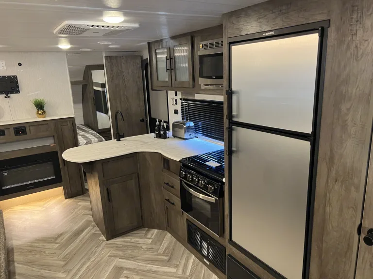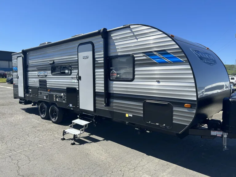 Gumball is a brand new 2022 Salem Cruise Lite Northwest travel trailer. Featuring an exterior awning with hideaway kitchen with mini fridge and griddle for cooking your fresh caught fish! Enjoy your evening dining experience with exterior lights and stereo speakers for ambiance. Around back you will find an easy access shower to rinse off after a dusty day on the trail. The back end of the trailer also includes an exterior door to access the bathroom that has a walk in shower/bathtub, so you don't have to disturb the main cabin. But if you forgot that one item in the kitchen, go through the second door to access the cabin area before returning to your party. Don't forget the large storage space underneath for all of your adventure gear!The Main bedroom features a Queen bed, 2 closets and a 32" smart TV. With multiple USB outlets throughout the camper, your electronics will stay charged! With the slider extended the family area is extended up to 8 feet wide! Both the sitting area and dinette areas convert into sleeping areas. 2 twin sized bunk beds with Teddy bear cushions are perfect for younger children. The bathroom door is next to the large pantry, 11 cu ft. refrigerator, 3 burner stove and oven, large counter and large, deep basin sink. All cabinets and doors are soft closing. Enjoy your time inside watching a movie with the family on the 42" smart TV while warming your toes in front of the multi color, electric fireplace!Hitch Weight 736 lb.