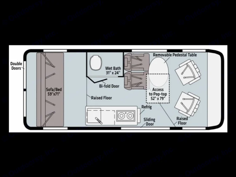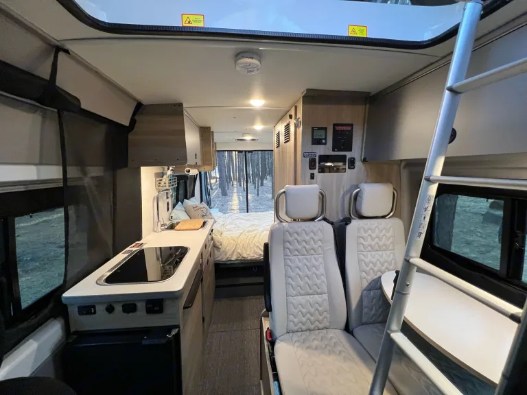 2 near-queen sized beds,fold down sofa bed 59”x72” in the back and 59”x79” in the popup roof. Bathroom has a cassette toilet as well as a shower. A kitchen with refrigerator, 2-burner propane stove and sink make this the perfect road trip vehicle! Coach battery, recharged by both driving and solar panels, will provide enough power to keep the lights on and all your devices charged up!Power: