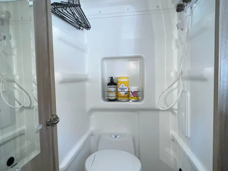 Swiveling cassette toilet (super simple to dump in any toilet or RV dump station)Seating: