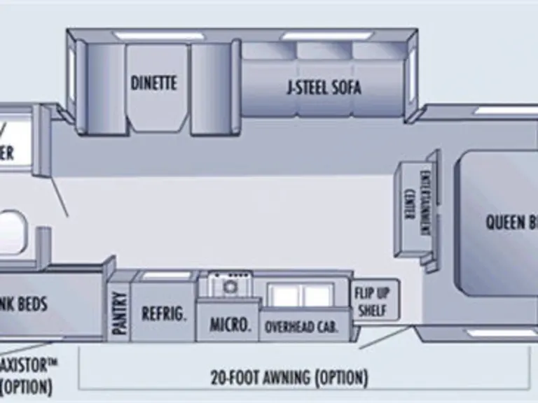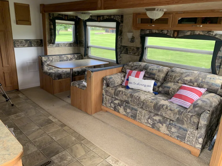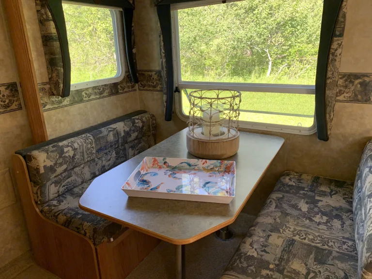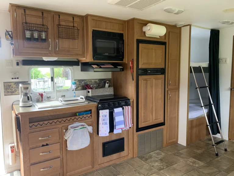 Our cute home away from home features a comfy queen bed, accessible from both sides where there is a night stands and ample closet space. The Slide out makes the space feel roomy and comfortable even with a full family. We also have bunk beds and a dinette bed and comfy couch that pulls out into a bed with a memory foam mattress. There is a storage closet for your shoes, umbrellas or jackets. The full kitchen is stocked with basic kitchen needs like a coffee maker, utensils, cups and bowls etc. and has ample room for the food you bring. The outdoor shower has hot water which is convenient after a day of outdoor fun and for pets. If you’re not experienced in towing a trailer we can deliver! We include camping chairs for adults and kids too if needed. We include camping area rug and trash receptacle for outdoors. We have everything you need to set up a comfortable camp. Plus we offer a number of fun extras! Check out our extras or Just reach out and chat with us.What's included2007 Jayco Jayflight features a slide for an extra roomy space.