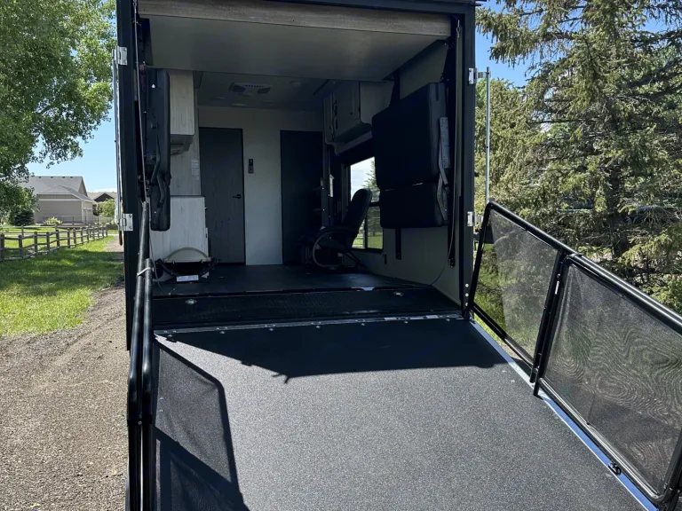 Glamping or camping, this easy-to-tow toy hauler is perfect for hauling toys with three different beds and just the right amount of indoor space to be comfortable without towing a massive RV.This RV features a modern interior, a large fridge, microwave, stove, and oven, and a good-sized indoor bathroom with a toilet, shower, sink, and vanity/mirror.The spacious master suite features a slide-out to accommodate a King sized bed, and tons of space for storing clothing and personal items.The dining table turns into a bed, and there’s a bunk above it so 3 total beds!There is also a power awning with LEDs, and the garage door turns into an adorable outdoor seating area/patio. There is also a screen to screen out the bugs while using the patio feature of the garage door. Indoor and outdoor stereo with Bluetooth.Exterior features include: