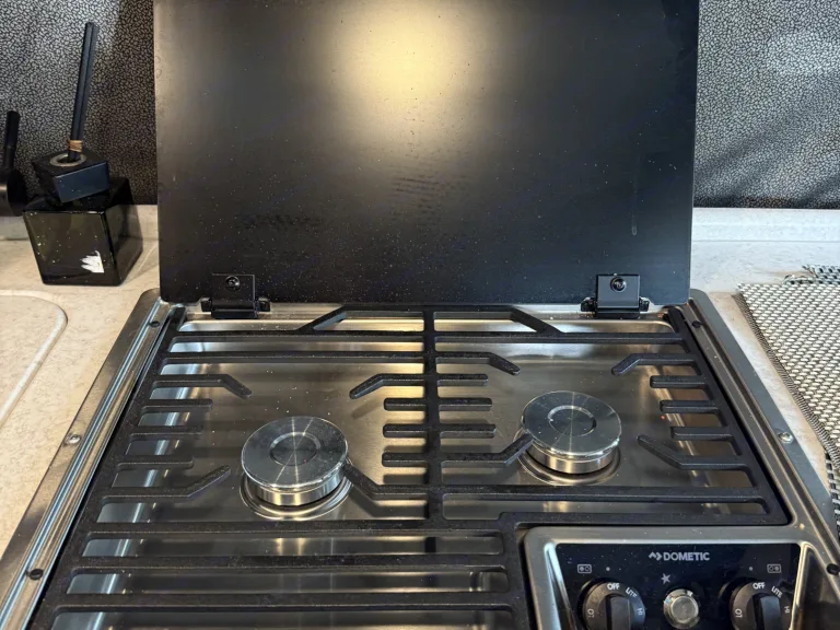 • Kitchen: 2-burner stove, microwave, fridge/freezer, and sink.